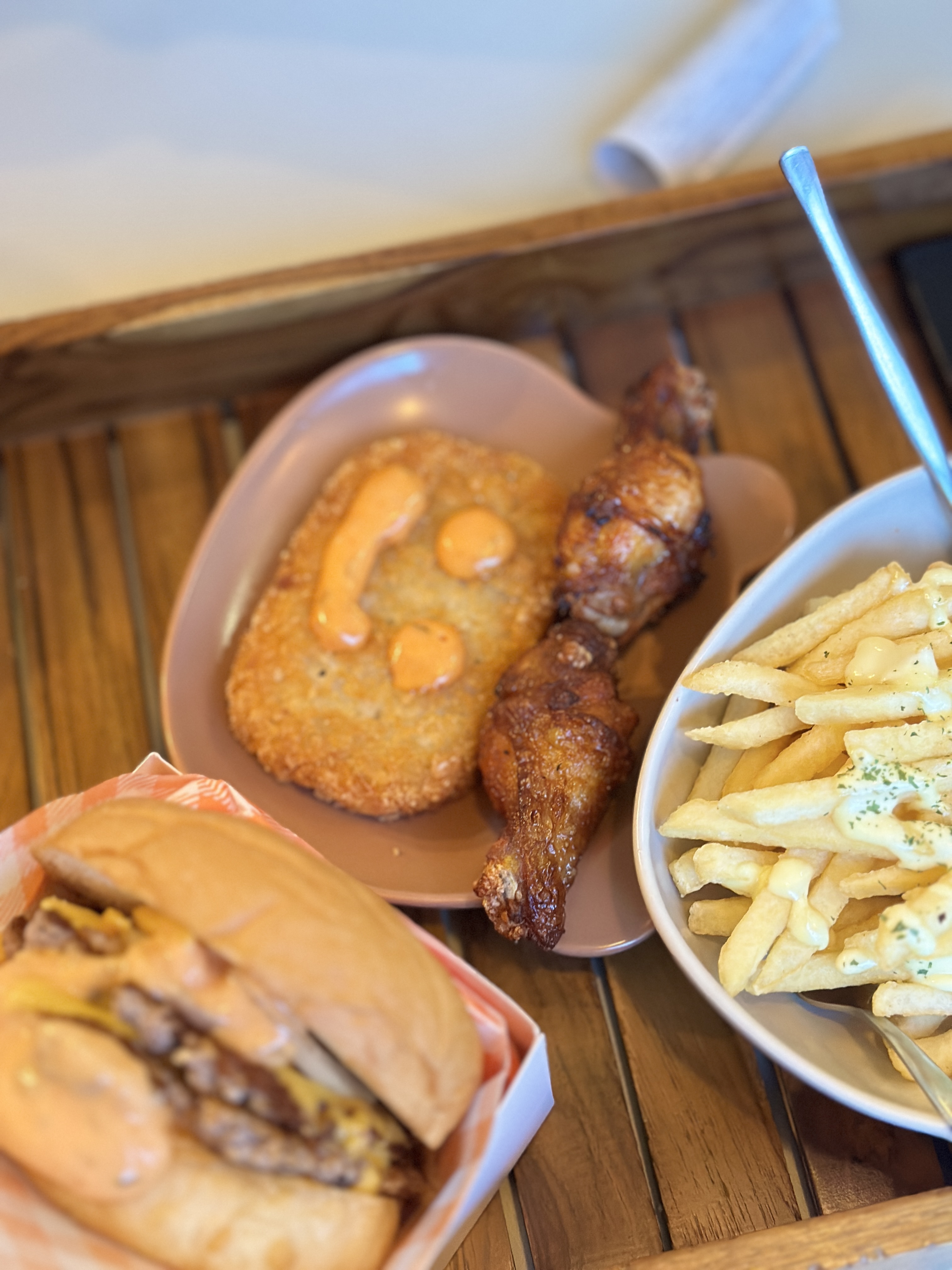 더블 치즈버거와 해쉬브라운 버팔로 스틱이 보이고요. 해쉬브라운에 소스 너무 귀엽게 짠거 아닌지