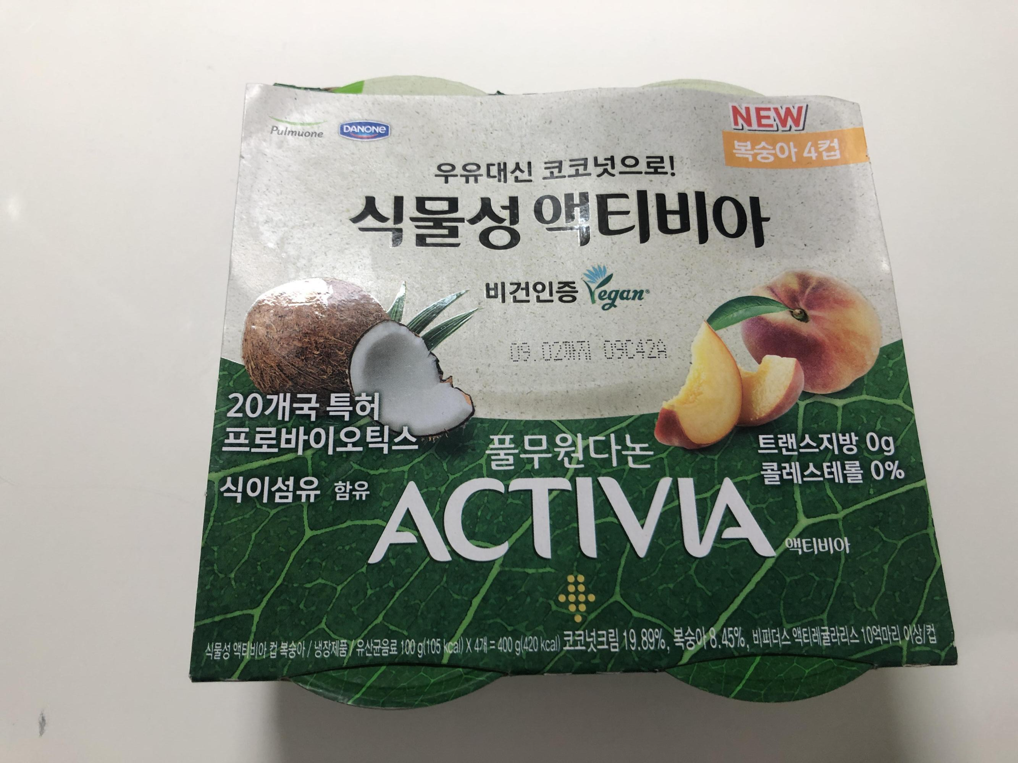 우유 대신 코코넛으로 만든 식물성 액티비아입니다! 저는 복숭아 맛을 구매했어요.