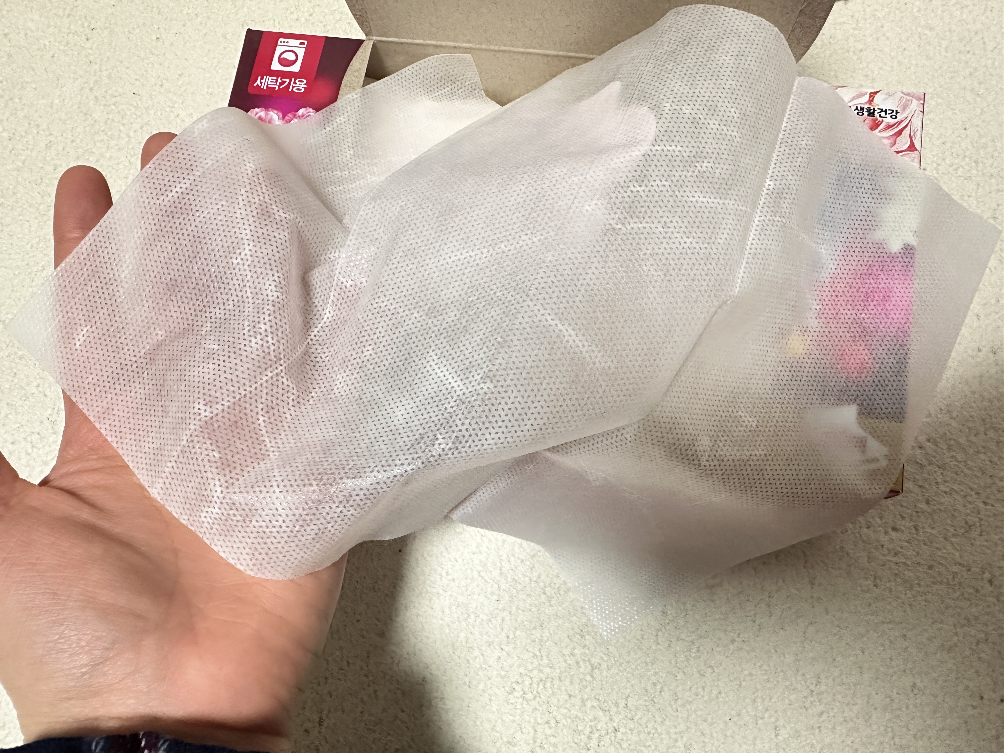 박스를 열어보면 이렇게 물티슈 형태로 되어있습니다. 한장씩 뽑아서 사용하기 엄청 편해요.