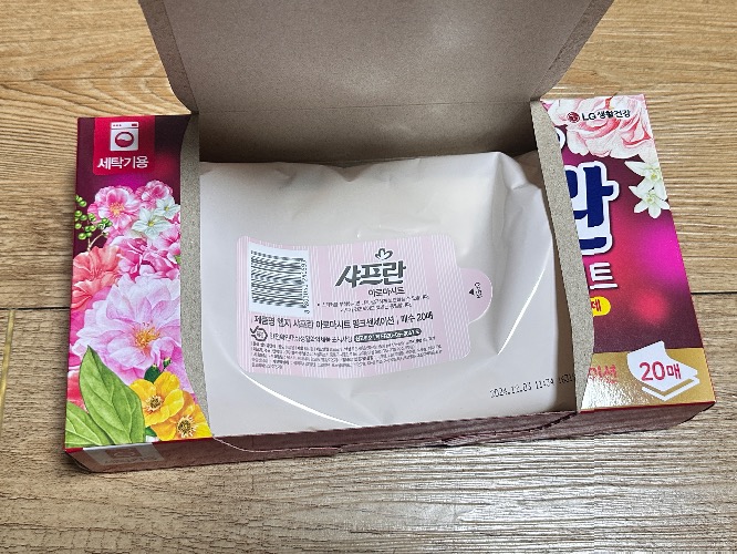 다이소 섬유유연제 샤프란 아로마시트입니다. 엘지생건제품이고요.