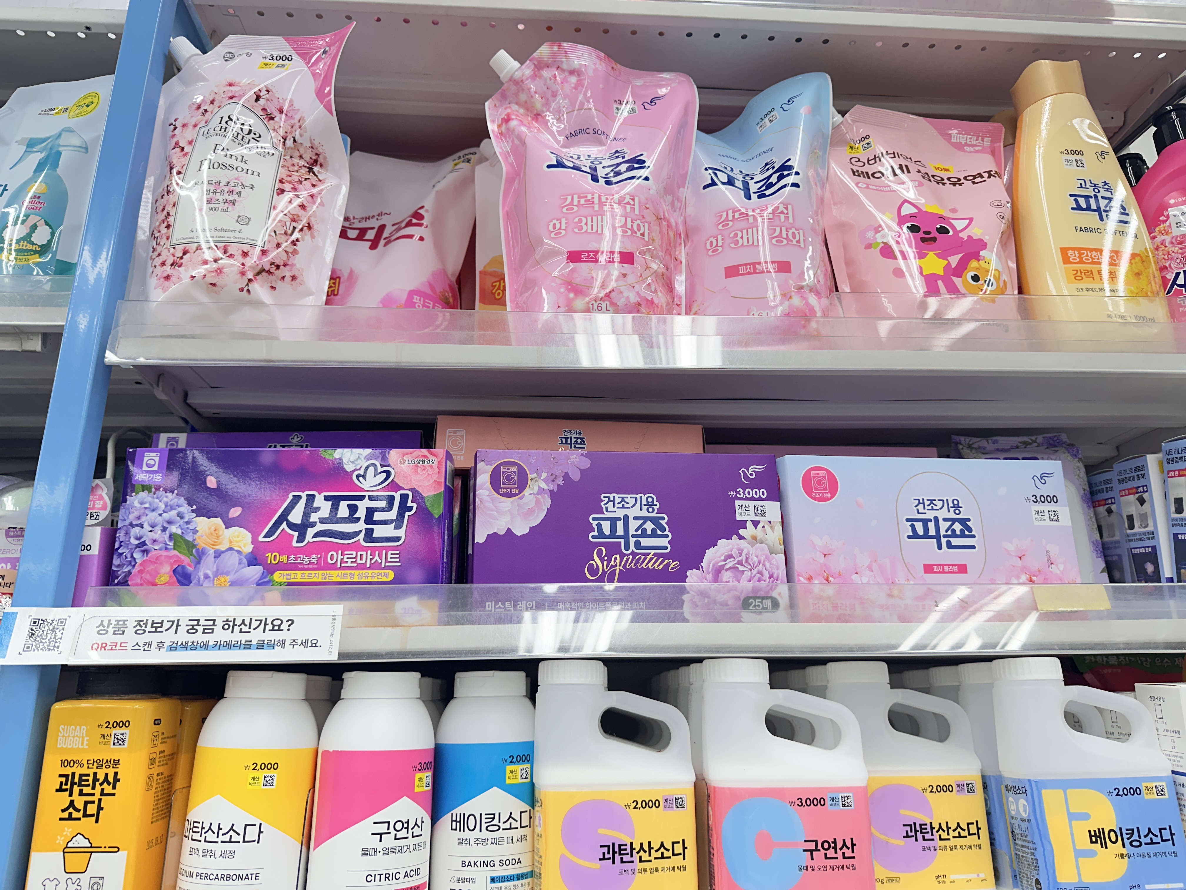 다이소 섬유유연제 종류입니다. 저는 세탁기용으로 구매했어요. 건조기용 제품도 있고요. 액상으로 된 제품도 있습니다. 과탄산 소다, 구연산, 베이킹소다 있는 코너에 있었어요.