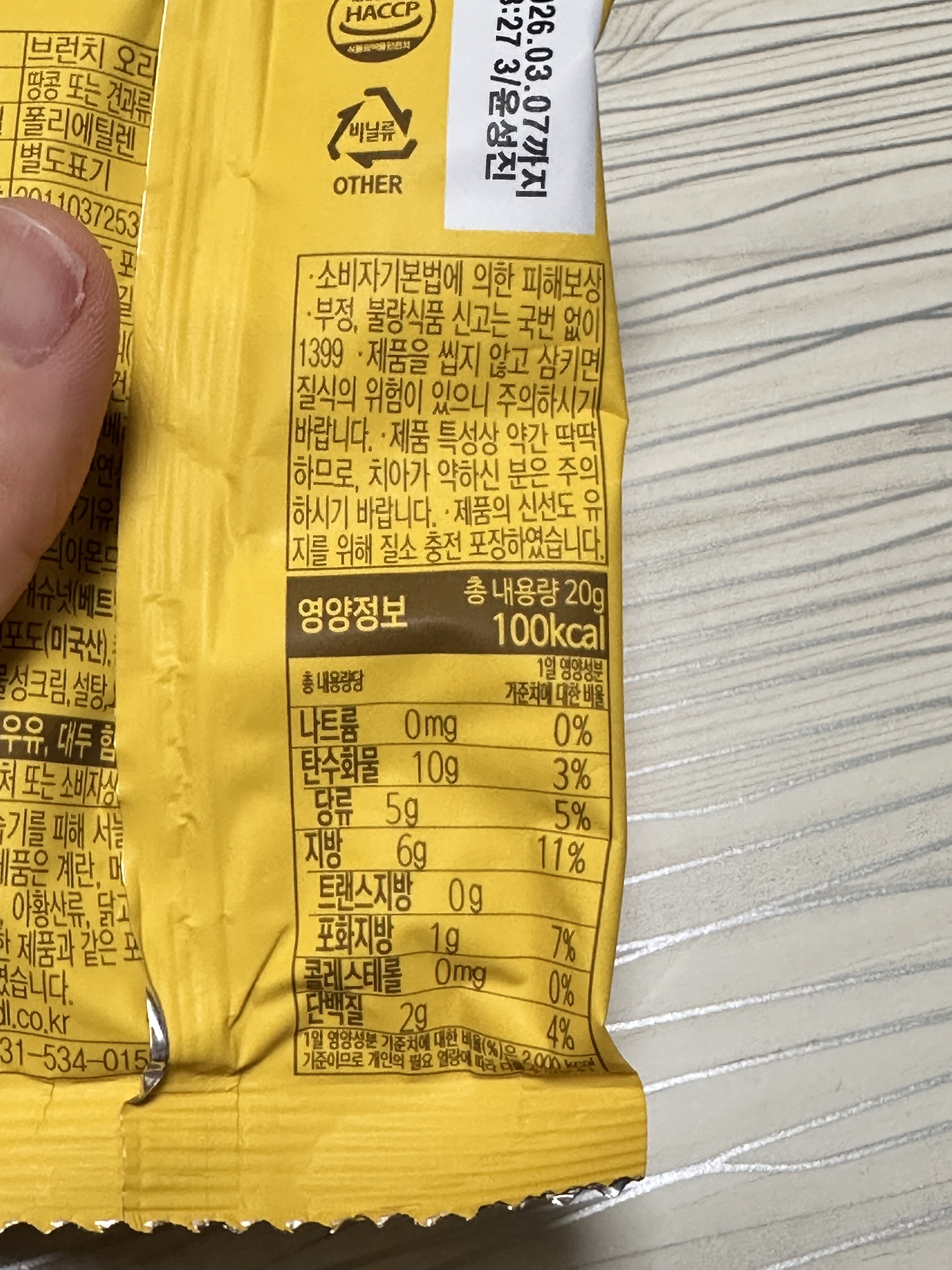 브런치 오리지널 하루견과 칼로리입니다. 총 20g에 백칼로리예요. 당류는 5g들어있습니다.