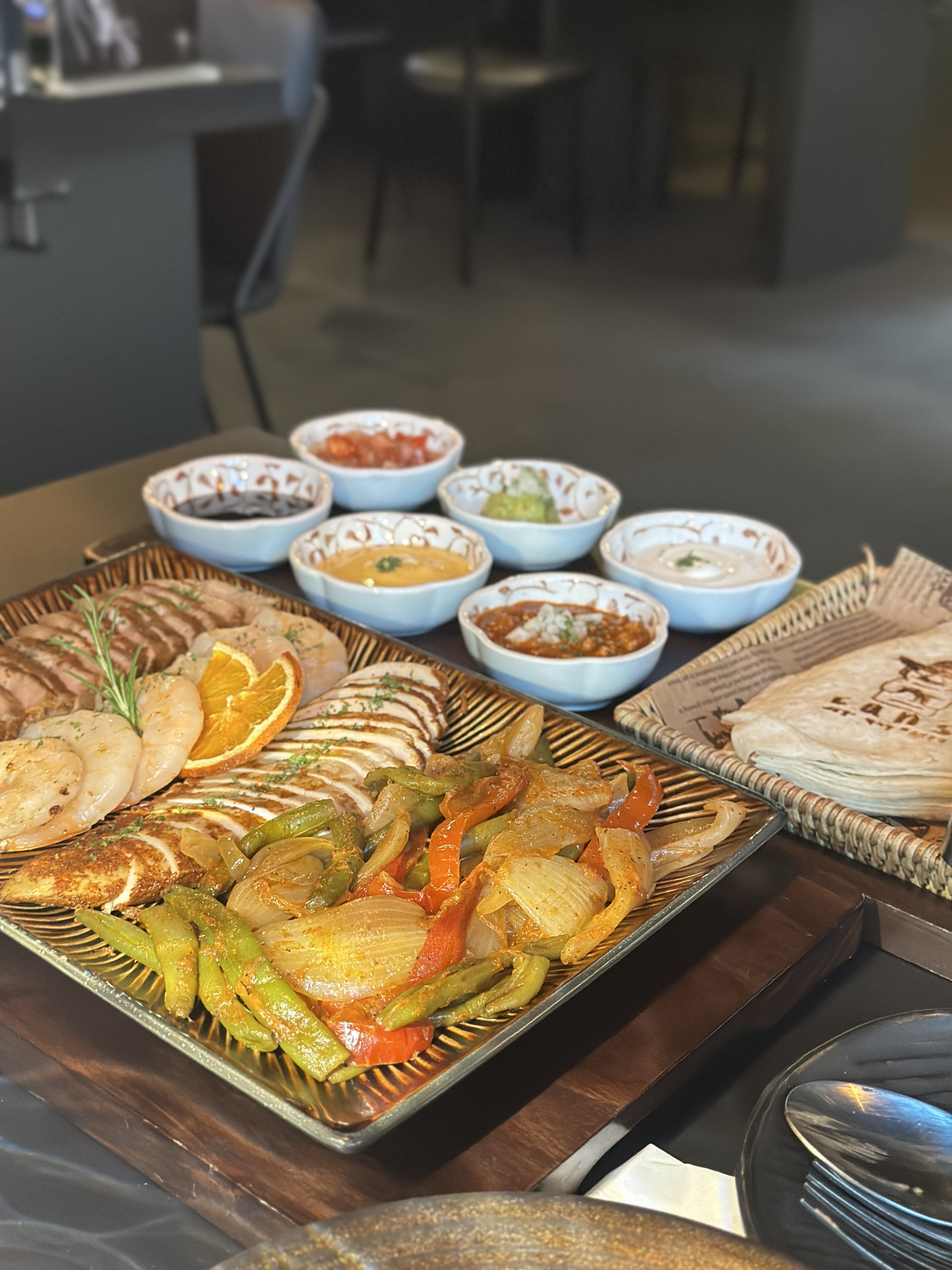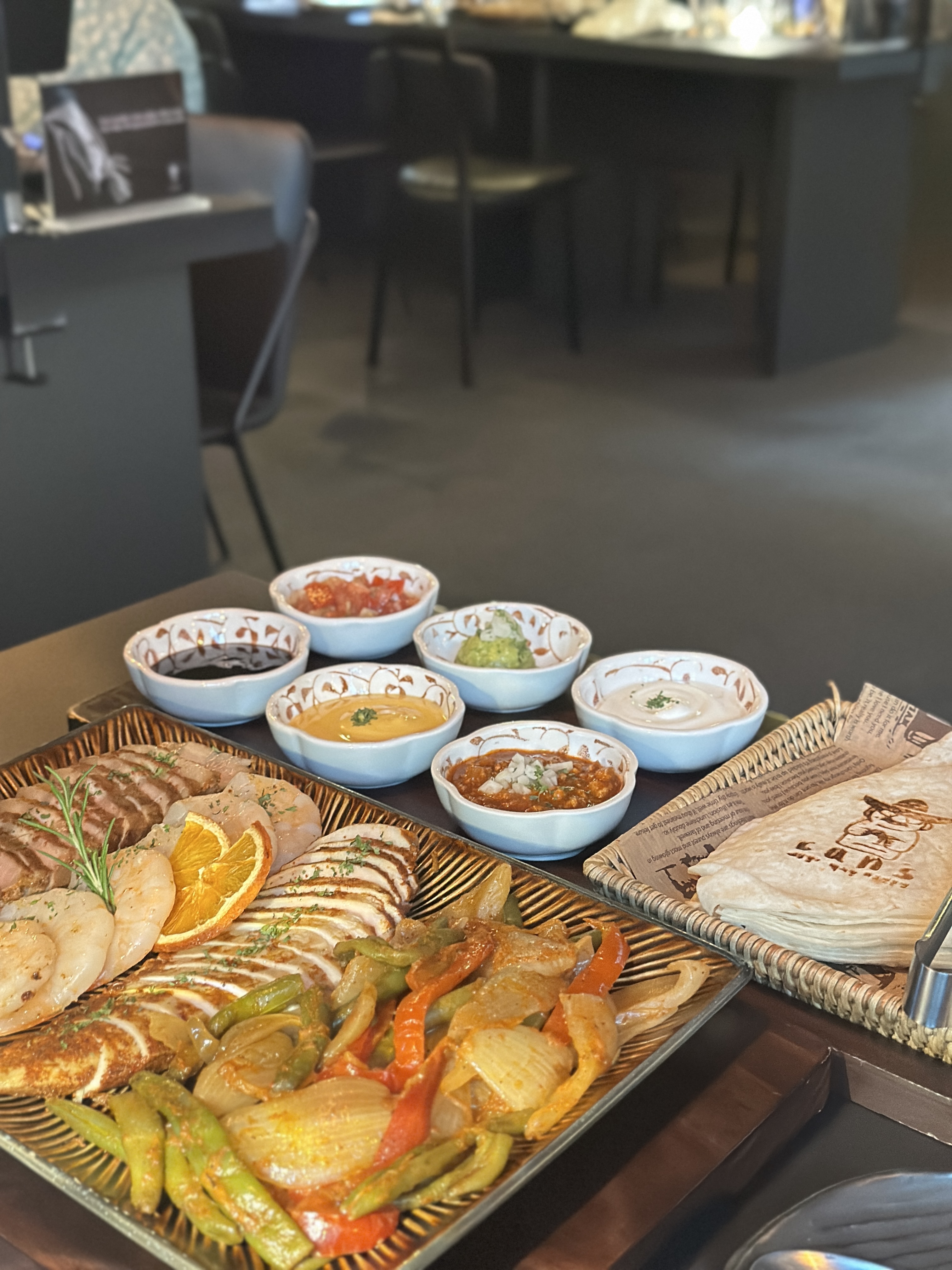 그리고 타코 플레터가 나왔는데요. 또띠아에 싸먹기 좋은 구운 야채들과 닭고기 새우 돼지고기가 함께 나왔어요.