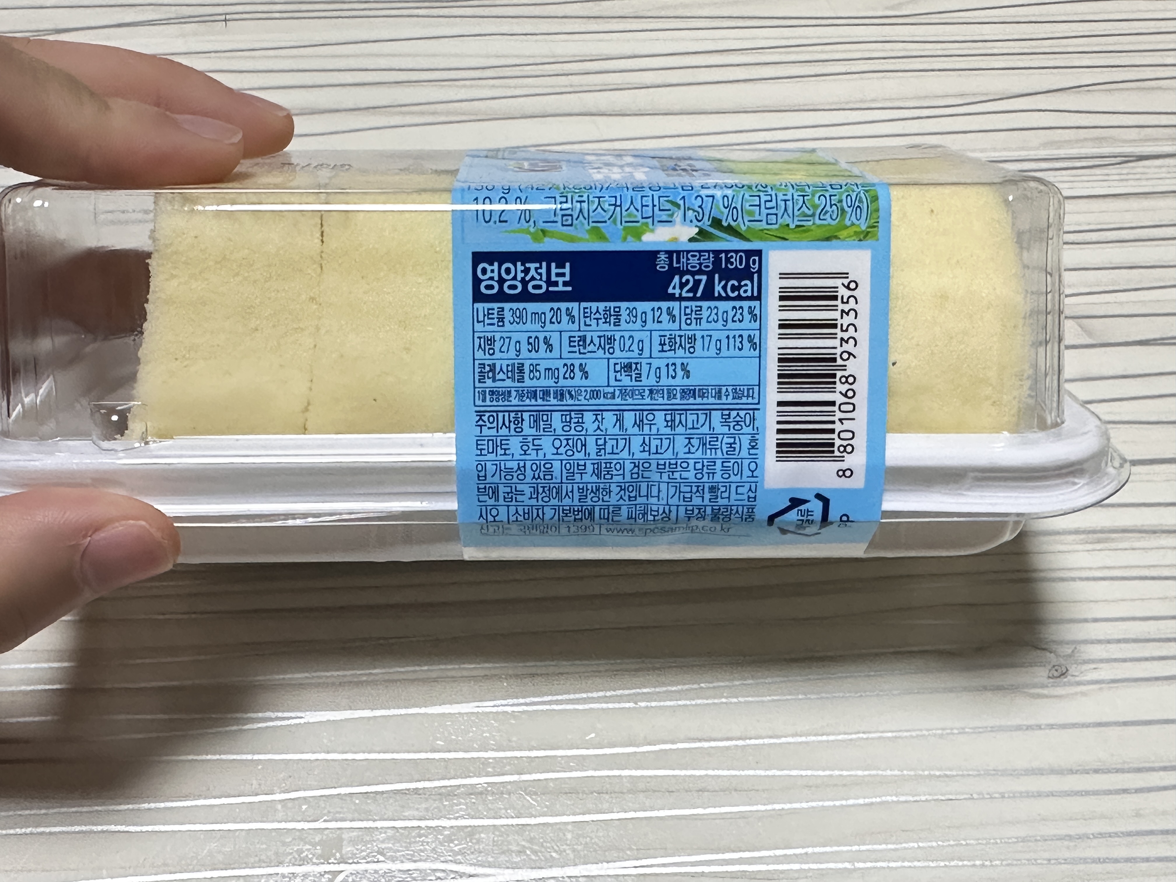끼리 크림치즈 쫀득 모찌롤 영양정보입니다. 총 칼로리는 427칼로리이고요 당류는 23g들었어요.