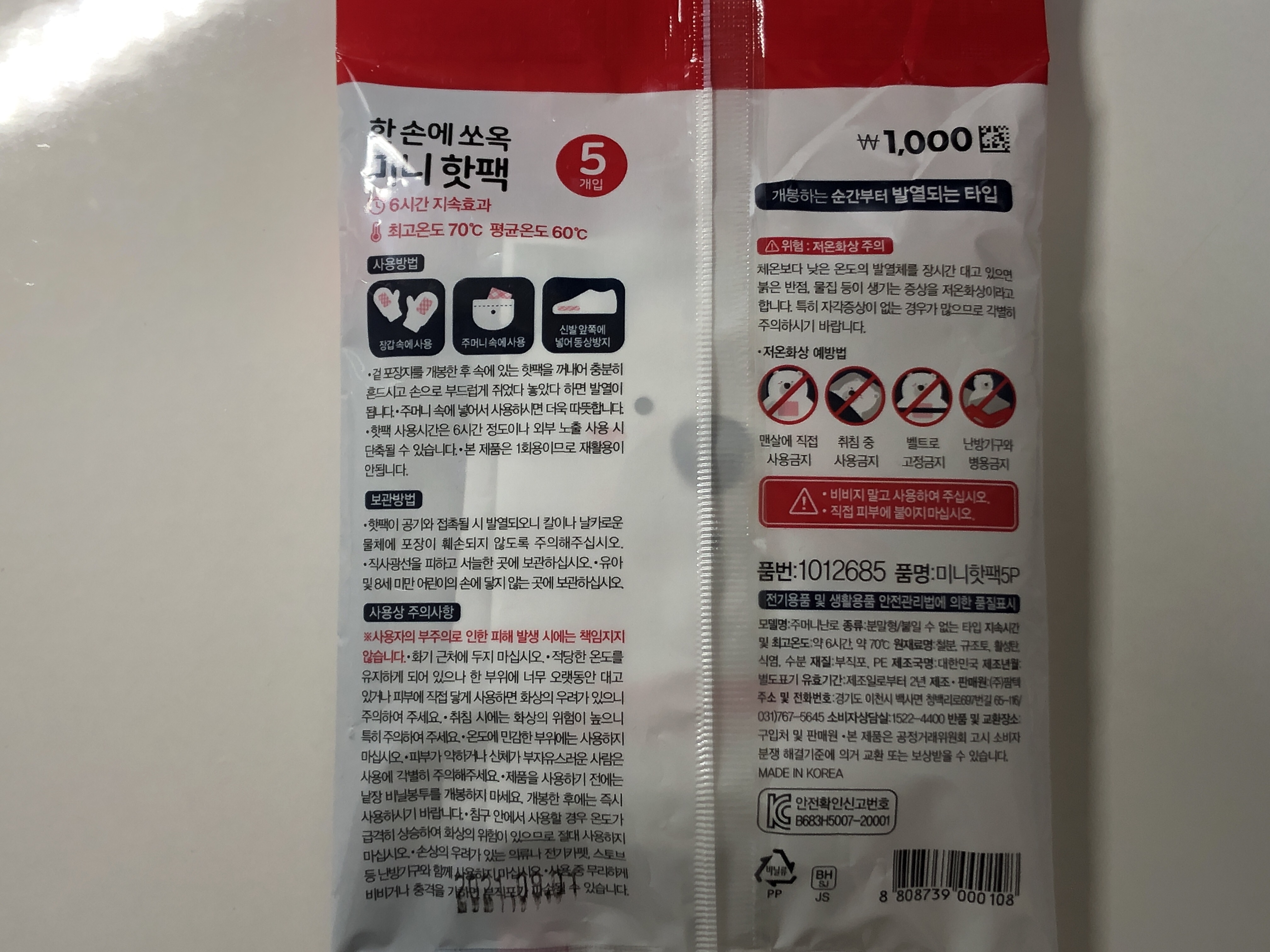 (다른 핫팩은 1개에 천 원인 것도 있더라고요. 물론 크기는 더 컸습니다.)