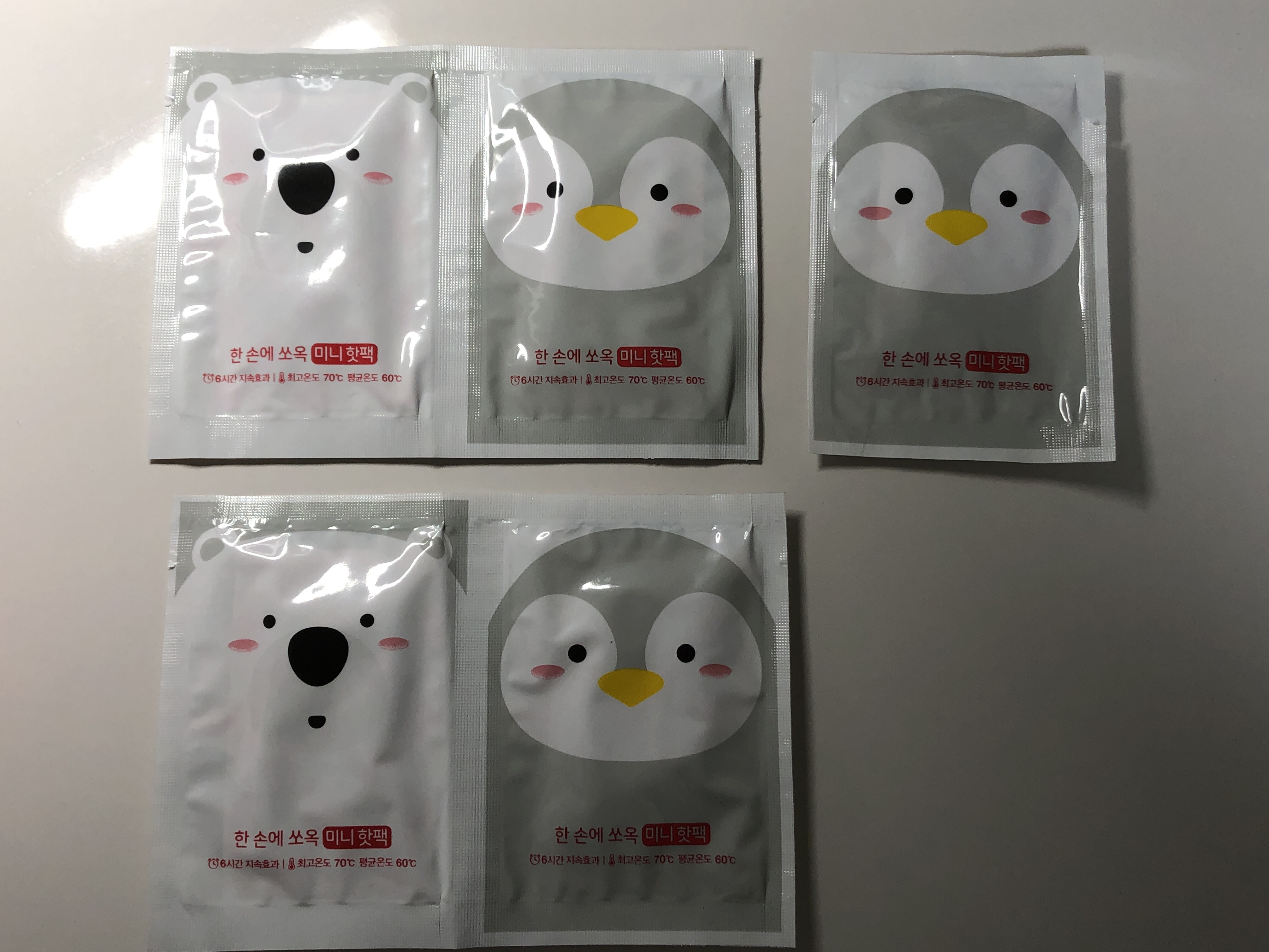 짠 패키지를 뜯어보면 귀염뽀짝한 펭귄이랑 북극곰 핫팩이 다섯 개 들어있습니다.