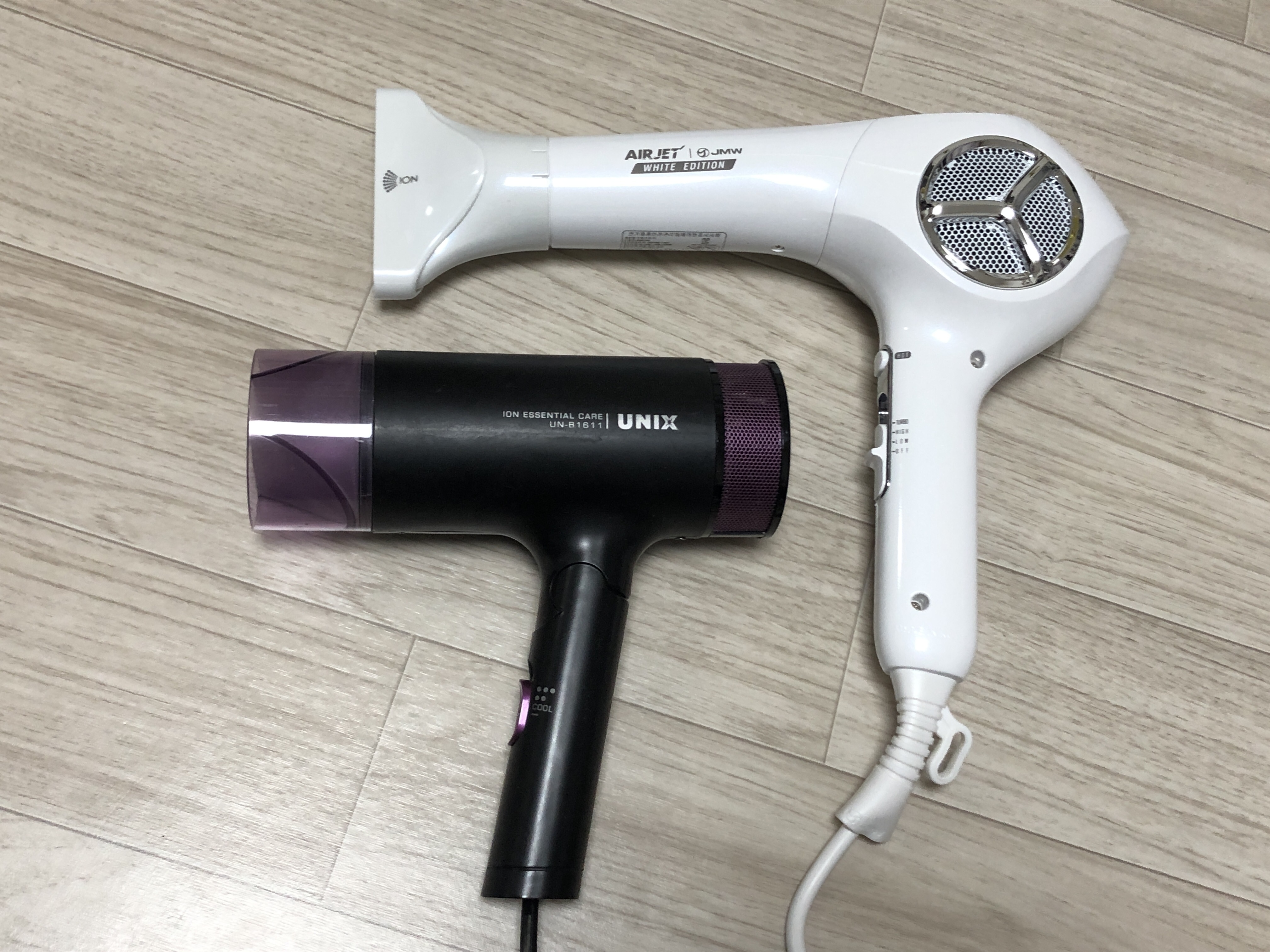 이건 전에 사용하던 유닉스 드라이기와 크기를 비교해봤습니다. 확실히 jmw가 큽니다. 물론 접어지지도 않아요. 이게 저에겐 제일 큰 단점이네요.