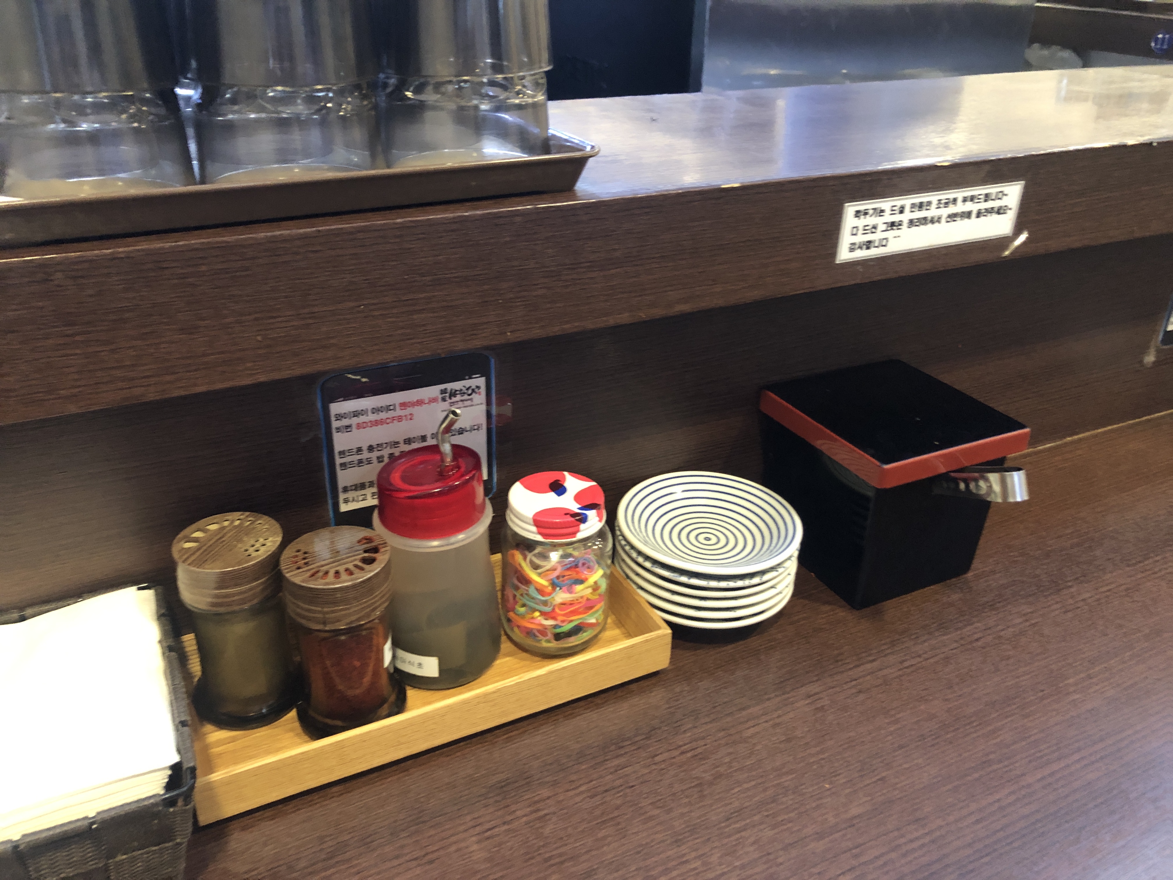 테이블에 반찬 양념, 고무줄도 센스 있게 비치되어 있어요~