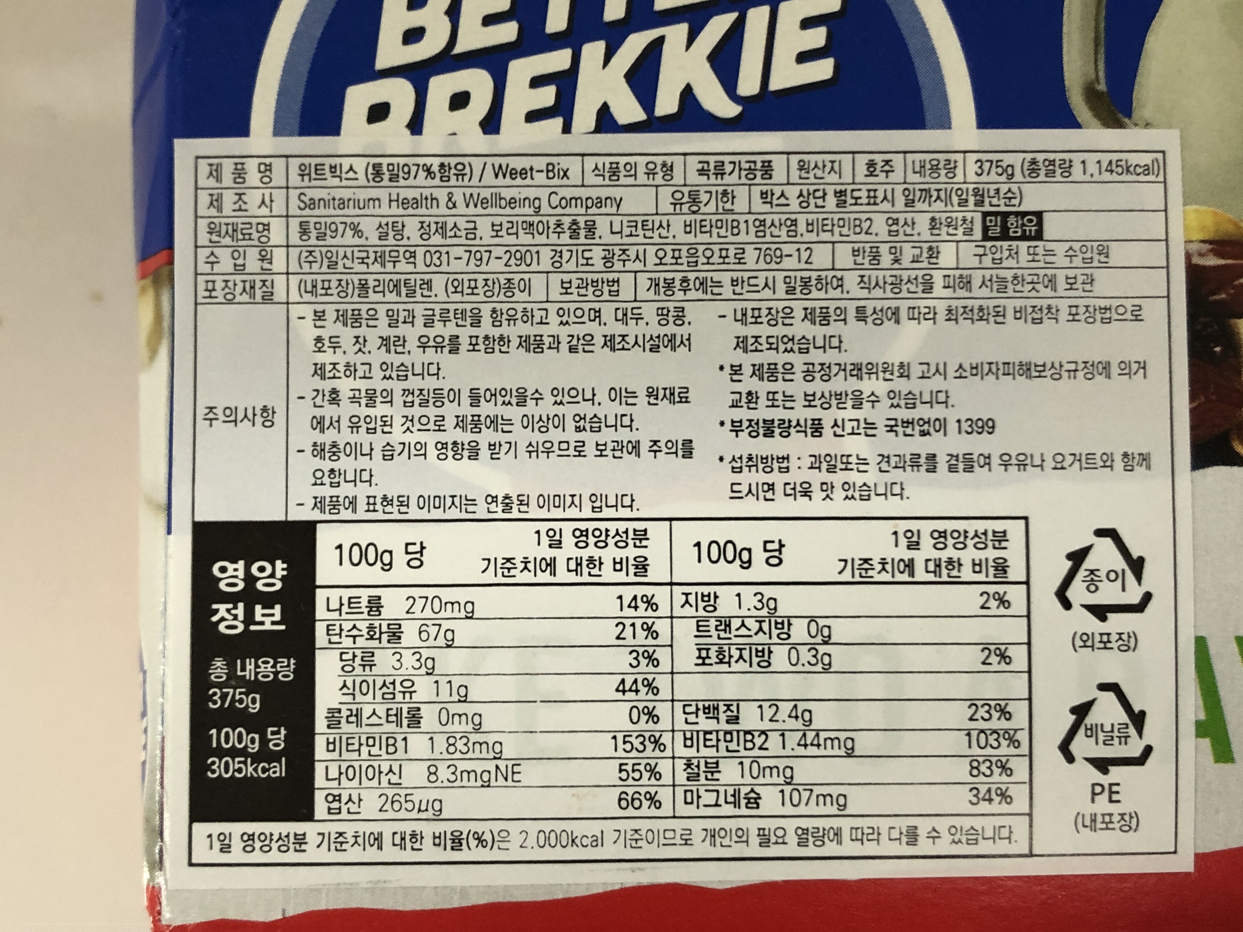 이번에 얕게 알아본 바로 탄수화물에 당류가 적고 식이섬유가 높으면 좋다고 들었는데 위트빅스는 과자같이 생긴 주제에(?) 식이섬유도 높고 좋네요..! 단백질도 저 정도면 많이 들어있는 거 같아요.