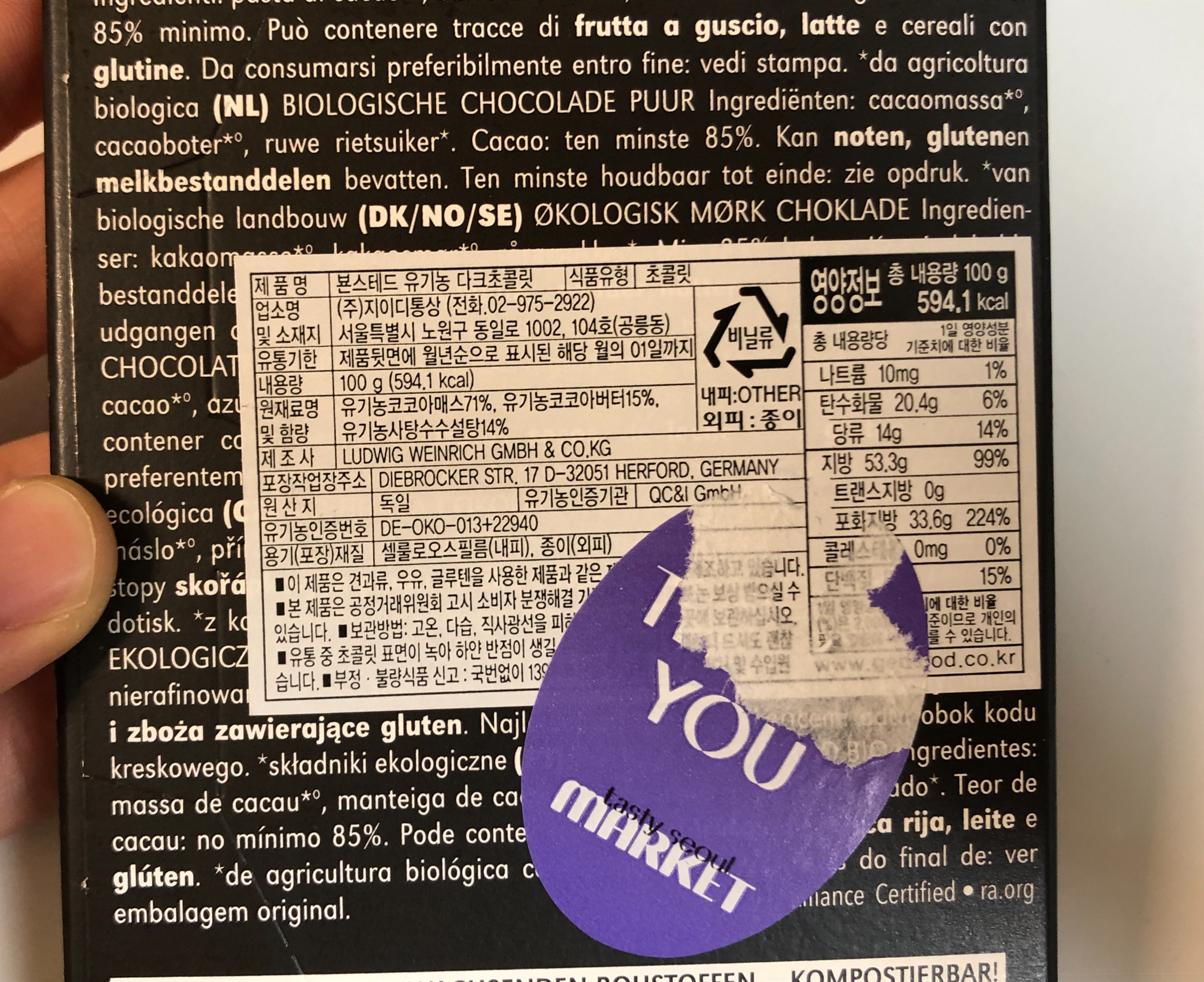 궁금한 게 코코아매스는 71%가 코코아 버터가 15%가 들어가 있는데 두개가 합쳐져서 카카오 함량 85%가 된 걸까요?ㅋㅋ 더하면 86%인데 1%는 뭘까.. 의식의 흐름... 아무튼 당류는 14g이 들어있어요~