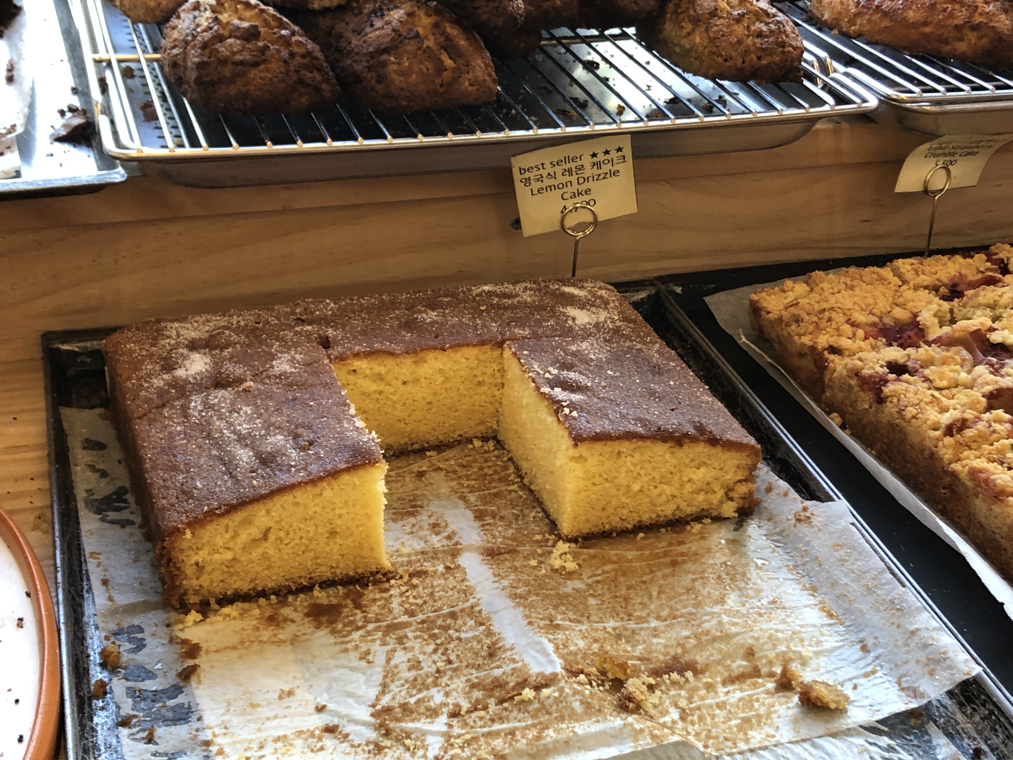 그리고 이 영국식 레몬 케이크 아주 추천드립니다! 빵은 파운드케이크나 카스테라처럼 생겼지만 윗부분에 레몬 제스트랑 설탕이 뿌려져 있는 게 너무 상큼했습니다.ㅠㅠ 글 쓰면서도 침이 고이네요.. 윗부분은 상큼 레몬 느낌 아래 빵 부분은 기본 파운드케이크 느낌이었어요. 레몬 들어간 빵류 좋아하시면 꼭 드셔보세요!