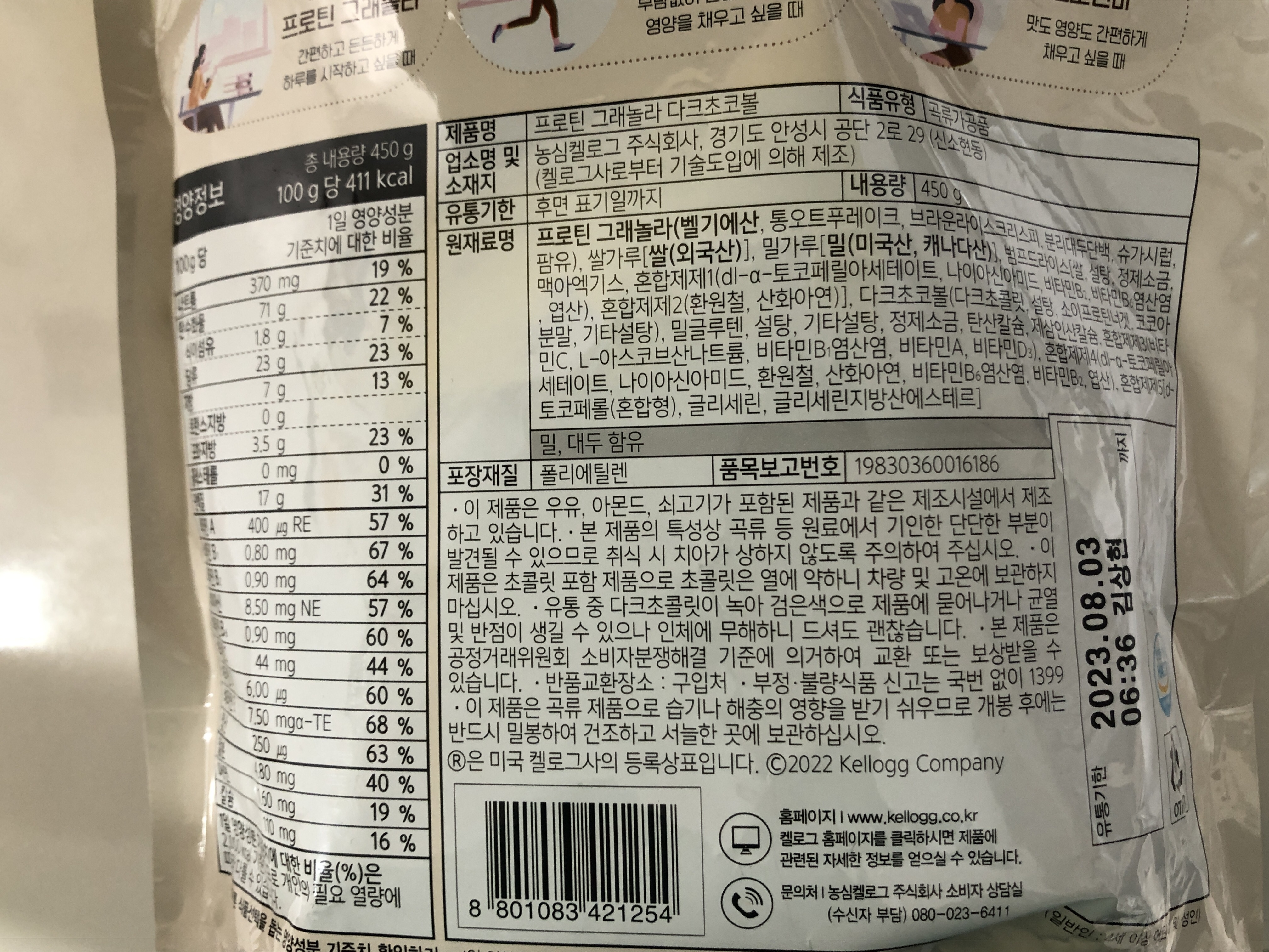다크초코랑 그래놀라 쌀 푸레이크 모두 단백질이 들어있다고 하네요~