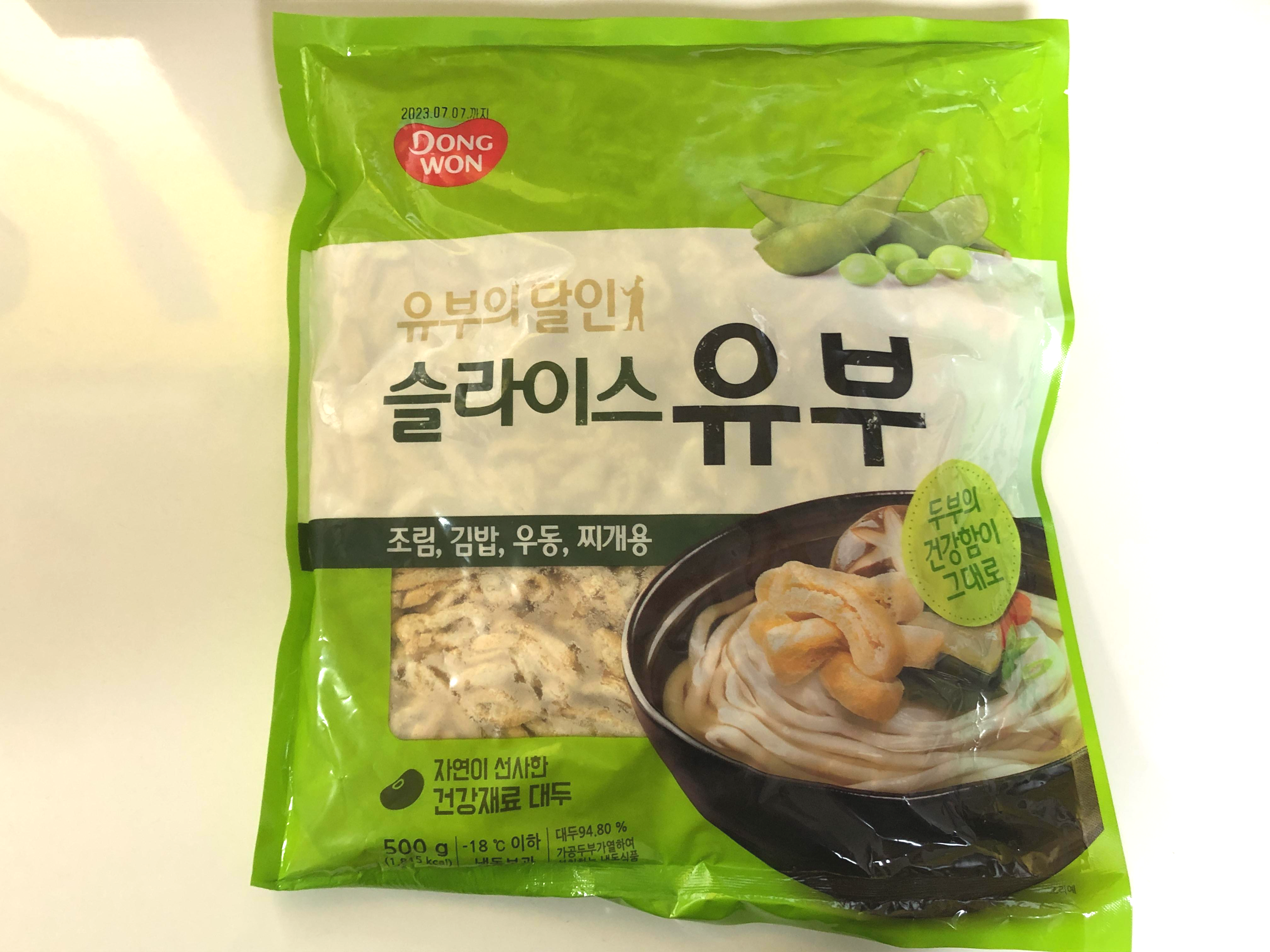 제품을 열어보면 슬라이스 된 유부가 냉동되어 있는 걸 볼 수 있는데요! 냉동제품이라 냉동실에 쟁여두고 먹기도 좋아 보여요~!! 확실히 자취인은 냉동식품이 제일 만만합니다..! 양도 500g이라 아주 넉넉해요.