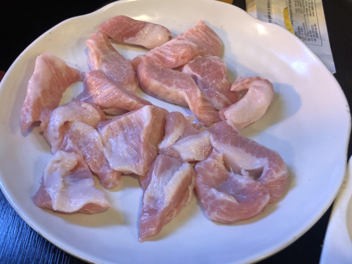 먼저 나온 뽈살2인분을 구워줬습니다. 저는 이번에 뽈살을 처음 먹어봤어요..존재도 잘 몰랐지요. 뽈살은 돼지 특수부위라 턱 관자놀이쪽 살이라고도 한다고 합니다. 지방이 적고 쫄깃한 식감이라고 하네요.