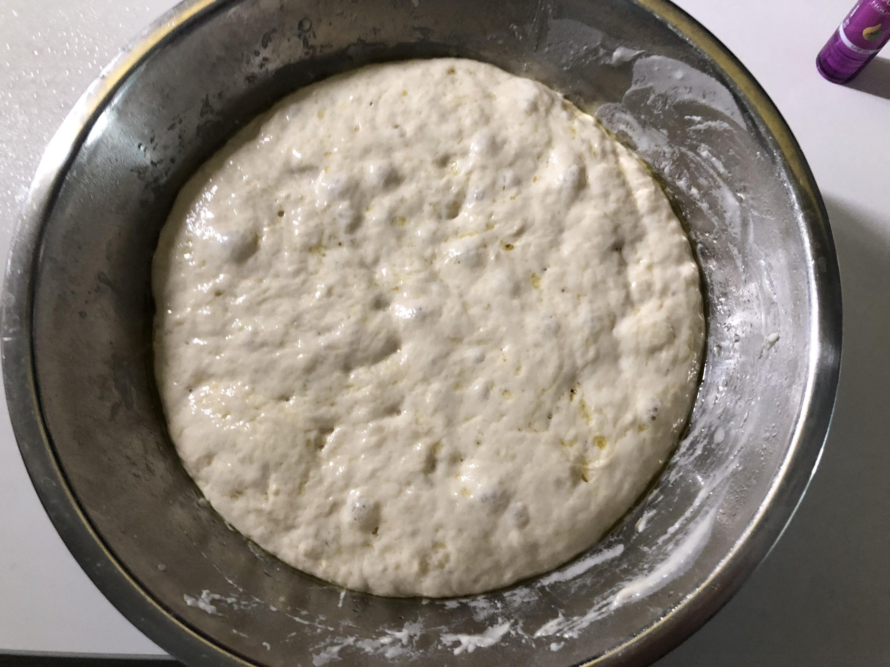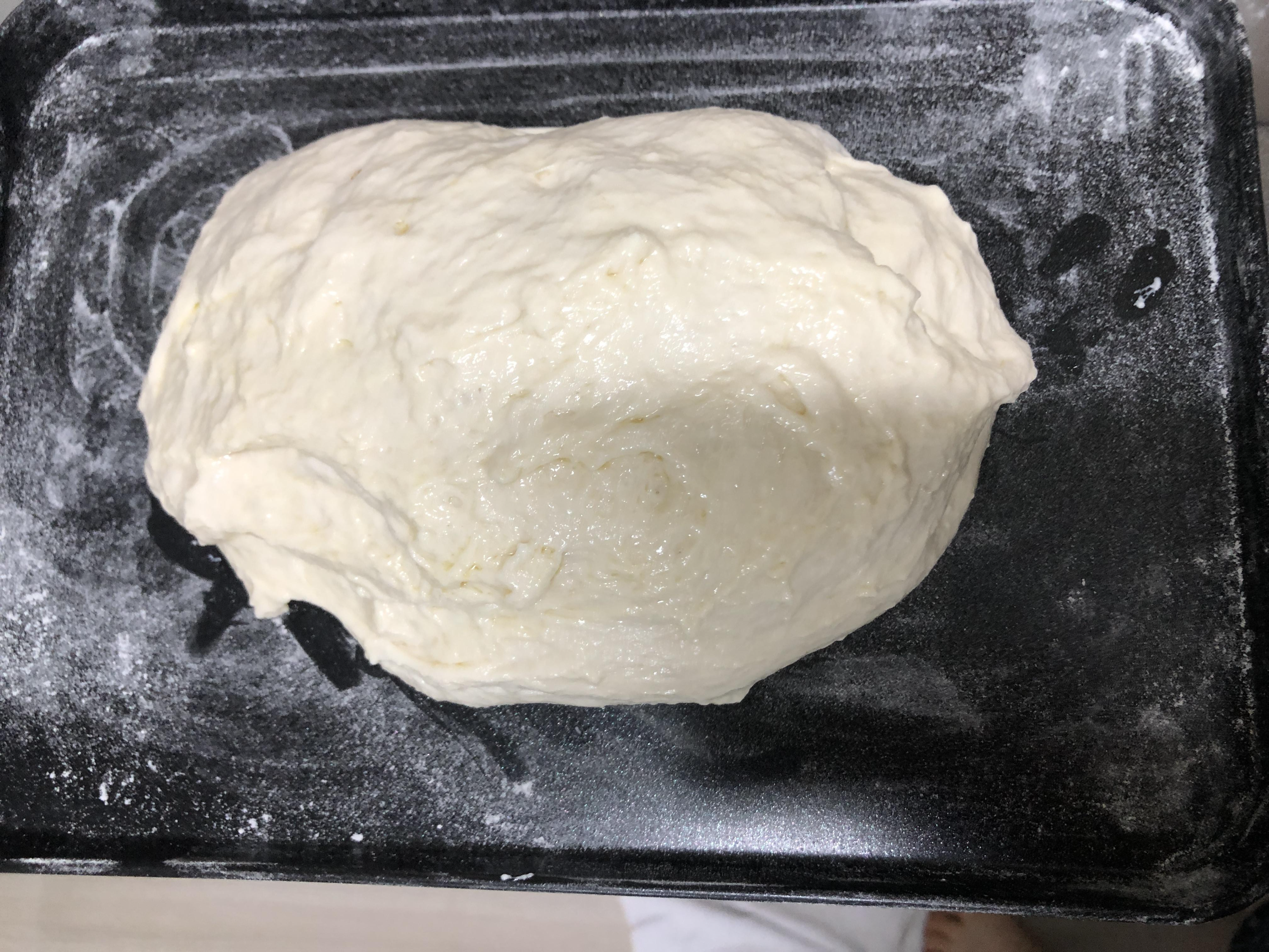 다음날 빵반죽! 발효되어서 빵빵해졌다. 제빵 많이 해본건 아닌데 차갑게 발효하는건 처음이라 이게 되는건가 걱정했는데 이게 됐다. 보통 따뜻한데 몇시간 두세요.. 였는데 신기하여라.