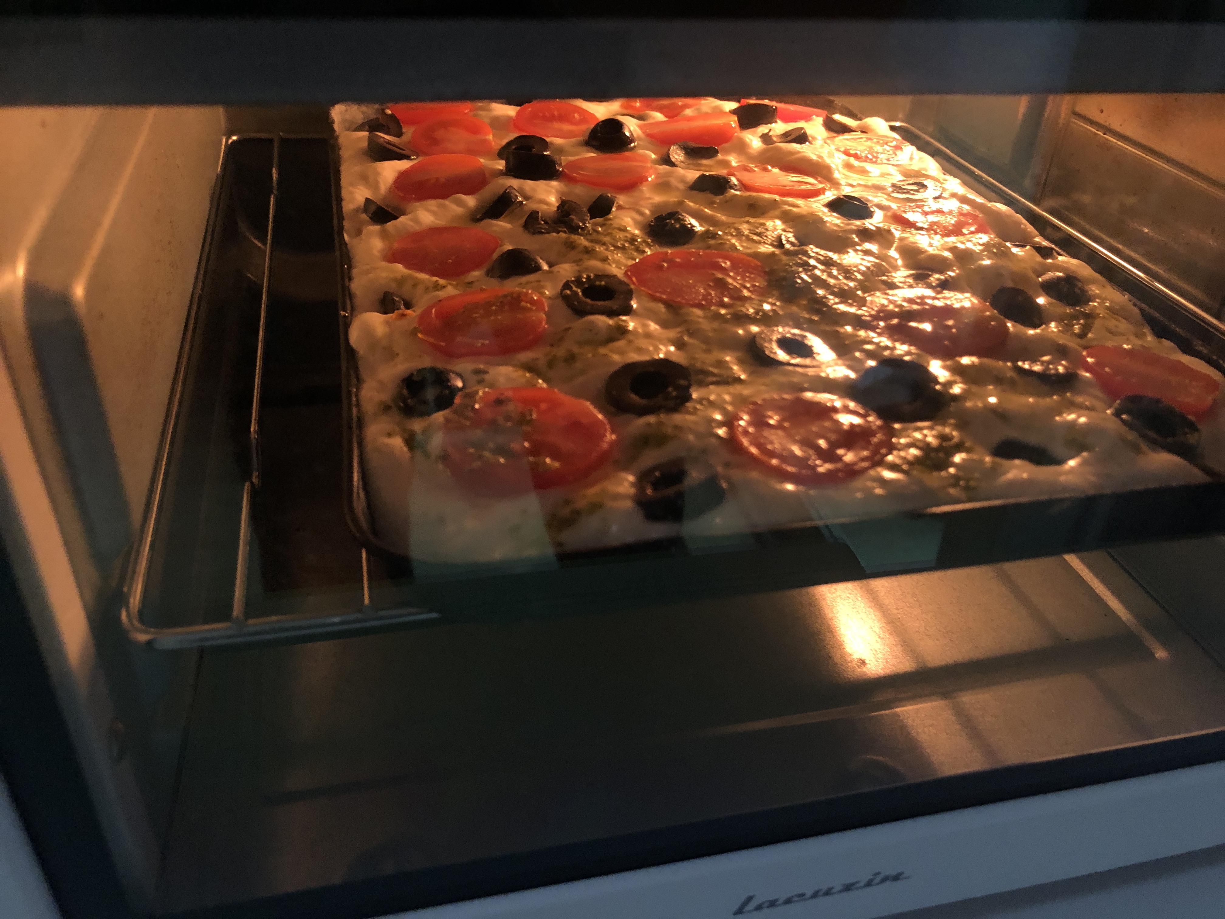 여기서 토핑 올리기 전에 손가락으로 가스를 뽁뽁이 터트리듯 뾰뵤뵤뵥 터트려주면 된다. 그런데 생각보단 반죽이 질척이고 유튜브에서 본거처럼 가스가 많이 빠지지는 않았다. 이유는 역시나 모르겠다. 토핑을 너무 많이 올렸는지 다 올리고 나서 좀 찔렸음. 과잉토핑...^^ 올리브유+물 섞은것도 뿌려주래서 위에 뿌려줬다. 왼쪽에 초록색 덩어리들은 집에 있는 바질페스토도를 살짝 흩뿌려줬다. 이건 나쁘지 않았음.
