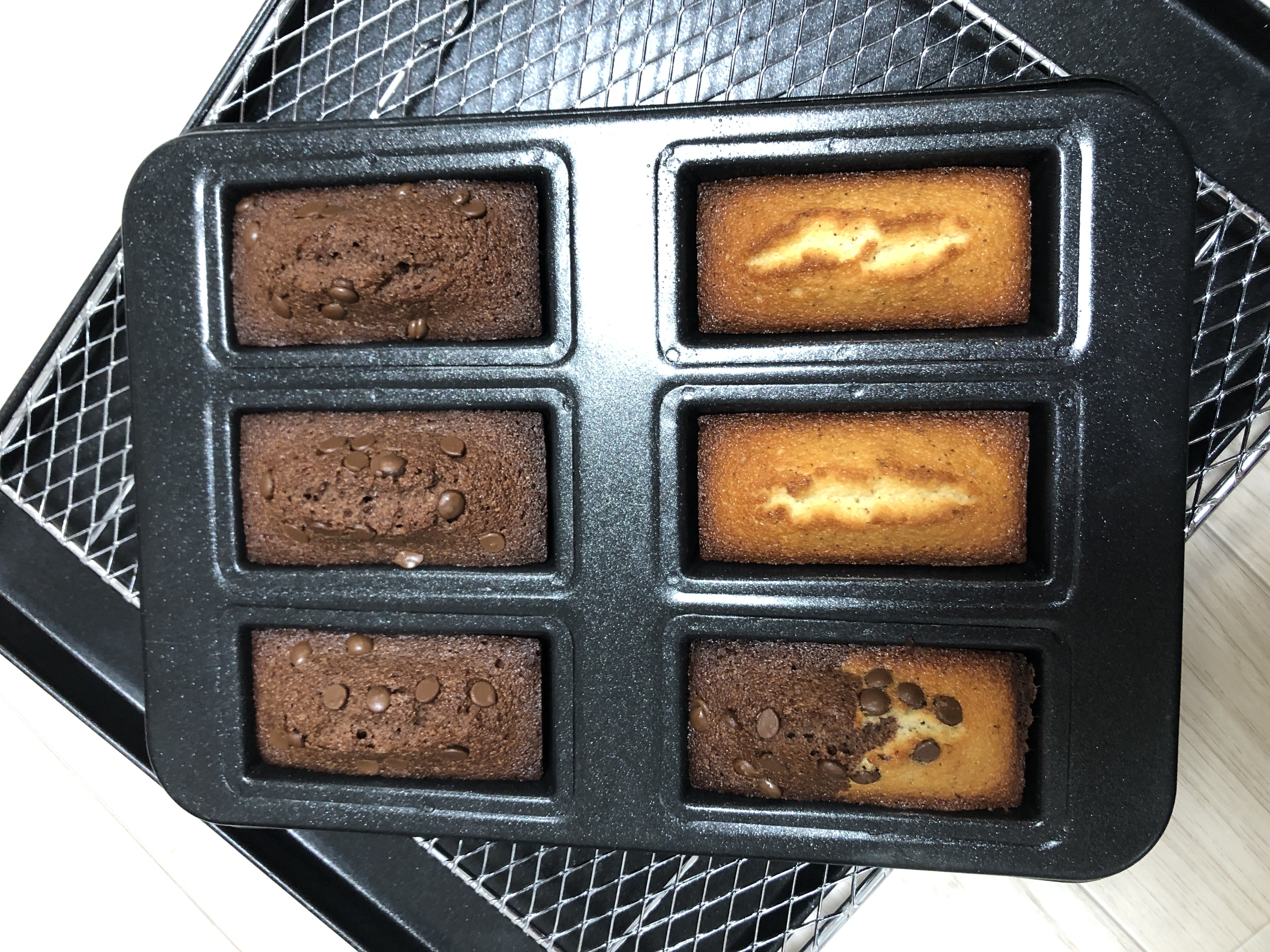 틀에 휘낭시에 반죽을 넣어줬다. 이번에 초코칩도 구매해서 위에 솔솔 뿌려줌. 초코칩이 맛있어서 계속 집어먹는거 참느라 혼났다. 또 애매하게 반죽이 남아서 초코반 플레인반 하프 휘낭시에를 만들었다.