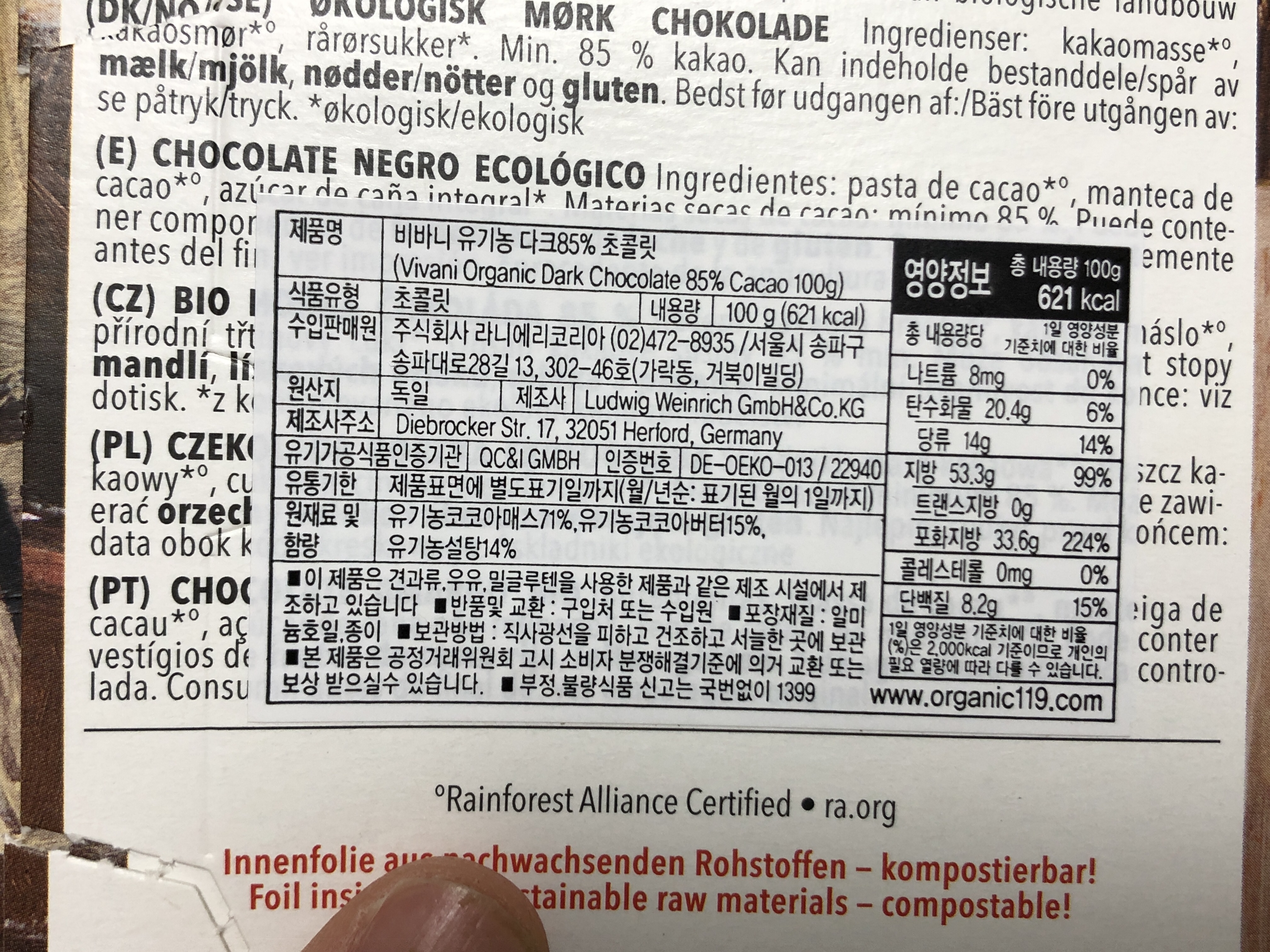 제품 생김새는 아래에 리뷰 남겼던 더현대에서 구매했던 뵨스테드 다크초콜릿과 비슷하게 생겼습니다. 이 제품도 유기농 제품이네요. 판 형태의 다크초콜릿 85%제품이에요.