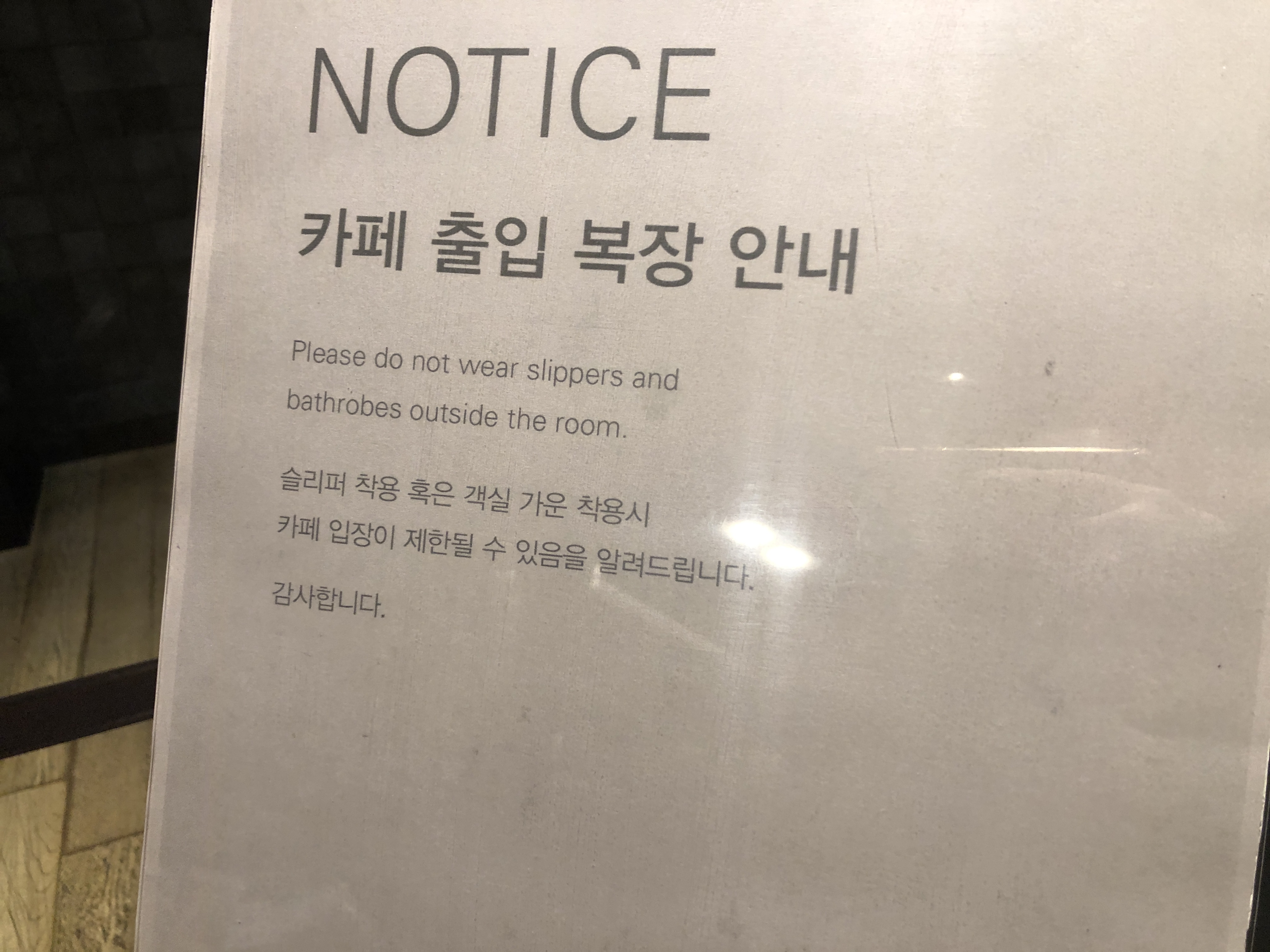 레스토랑 출입시 슬리퍼랑 가운 착용을 하면 입장이 제한될 수 있다고 하니 참고하세요! 친구는 신발 갈아신고 들어왔습니다ㅋㅋ