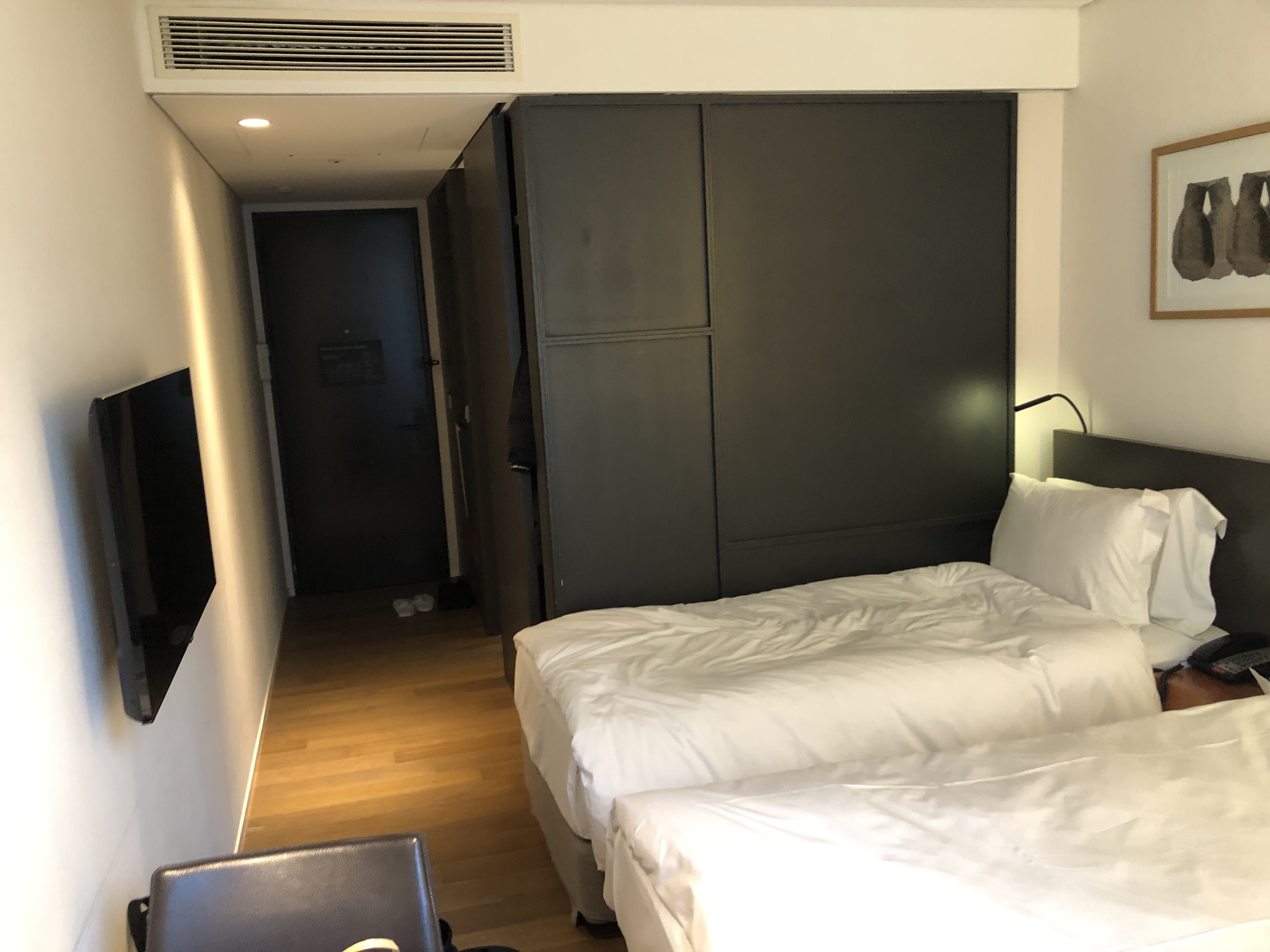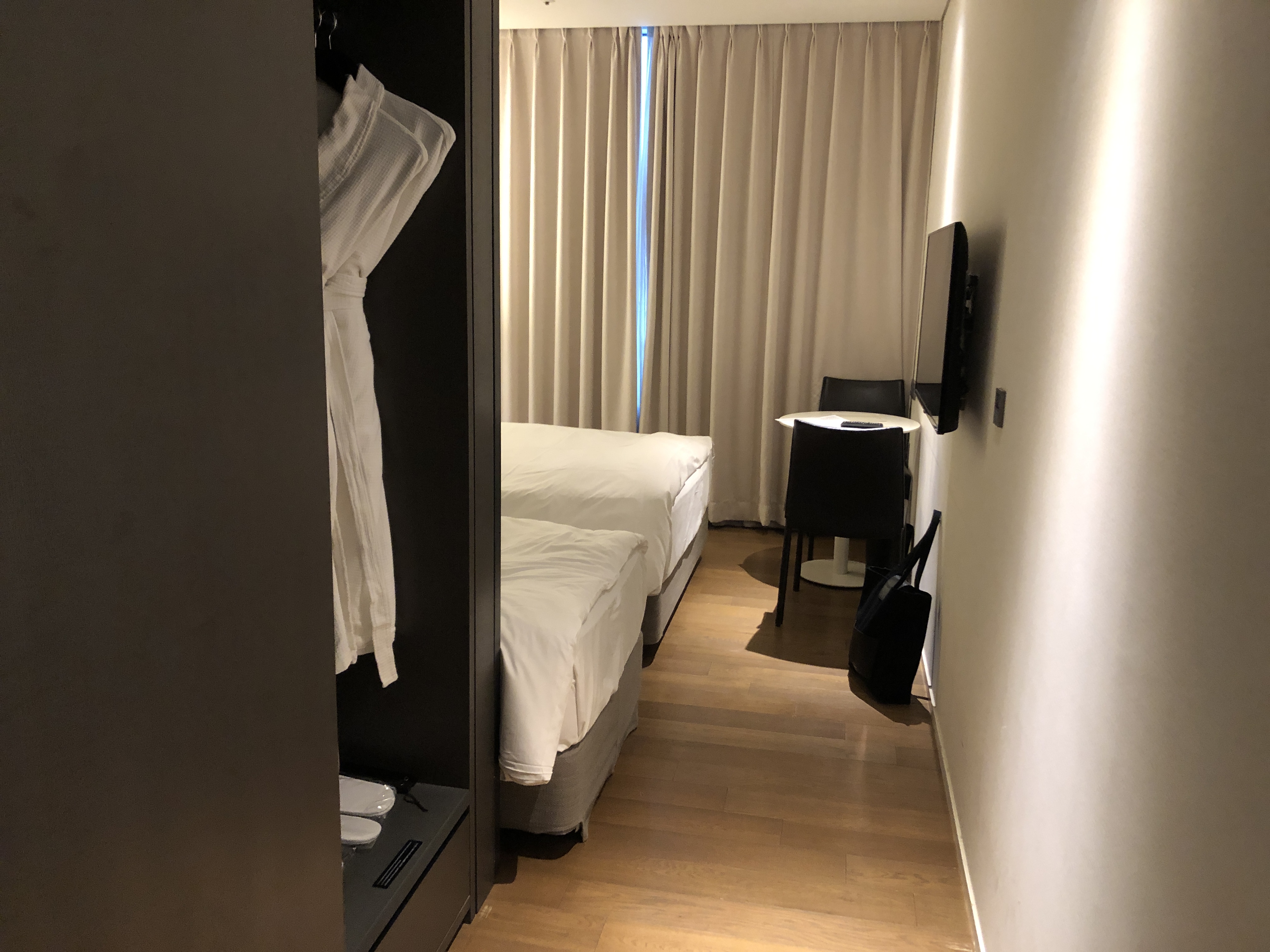창문 쪽에서 바라본 객실 뷰. 확실히 좁긴 합니다. 그리고 화장실 쪽 검정 가벽은 가벽인 줄 알았는데 미닫이 문이더라고요? 열면 화장실의 샤워부스가 보입니다ㅋㅋㅋ 알고 나서 당황했네요.