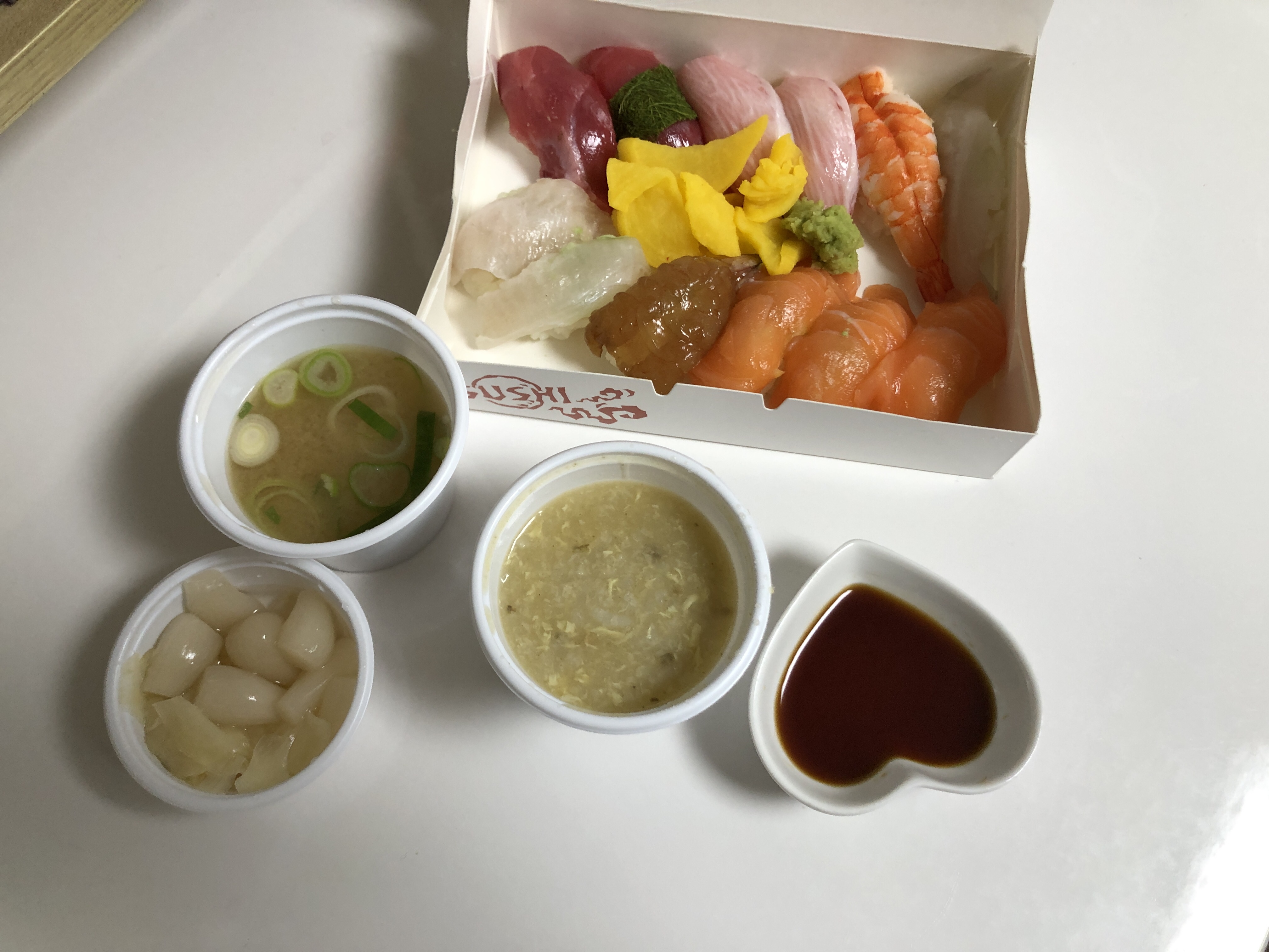 오늘의 초밥 구성은 초밥과 장국, 락교와 초생강, 간장 2개, 죽이 나옵니다.