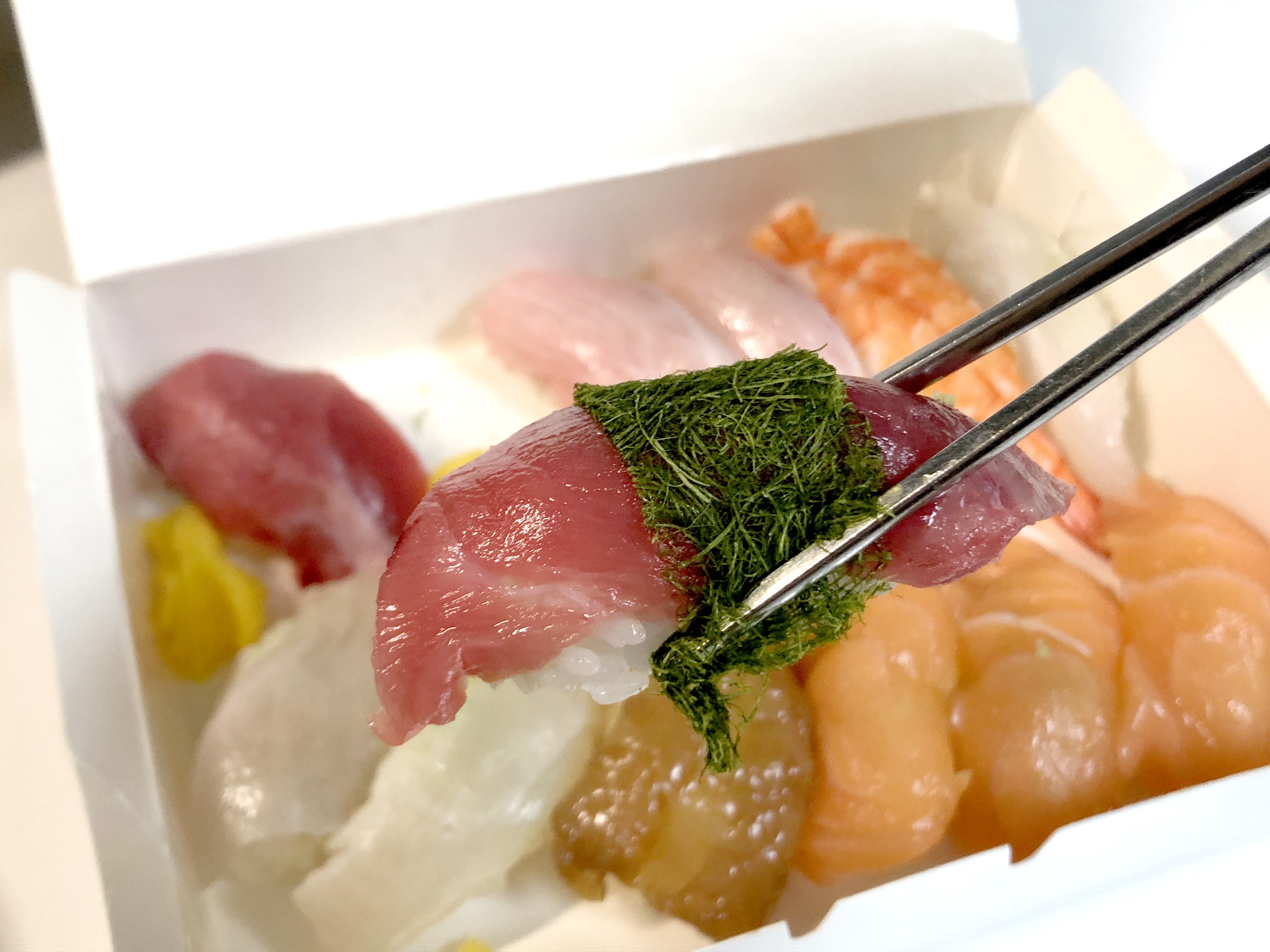 초밥의 종류는 참치4+연어3+광어3+초새우1+장새우1로 총 12p로 구성되어 있습니다. 배민의 음식소개에서는 오늘 들어온 활어 참치 숙성회로 포장된다고 하네요. 개인적으로 유부초밥이나 계란초밥도 없고 참치초밥이 4개나 들어가서 아주 만족스러워요. 제가 좋아하는 구성들입니다^^ 단무지랑 생와사비도 초밥 사이에 같이 넣어줍니다. 참치의 부위는 제가 잘 모르지만 색상이 다른 걸로 봐서 2가지 부위가 들어가는 듯합니다. 참치 초밥 하나는 감태에 쌓여 있습니다.