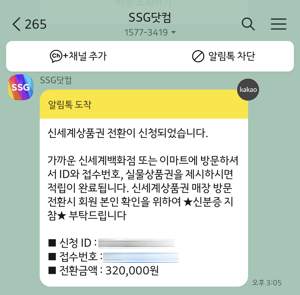 알림톡으로 제가 가지고 있던 신세계상품권 320,000원을 포인트로 전액 전환되었다는 카톡이옵니다. 저는 아이폰을 이마트몰에서 정가보다 약간 할인을 받고 가지고 있던 신세계상품권을 모바일 포인트로 전환시켜서 아이폰 14pro를 구매했어요. 아이폰 구매 과정에 대한 자세한 내용은 다음에 포스팅을 남겨볼 예정입니다.