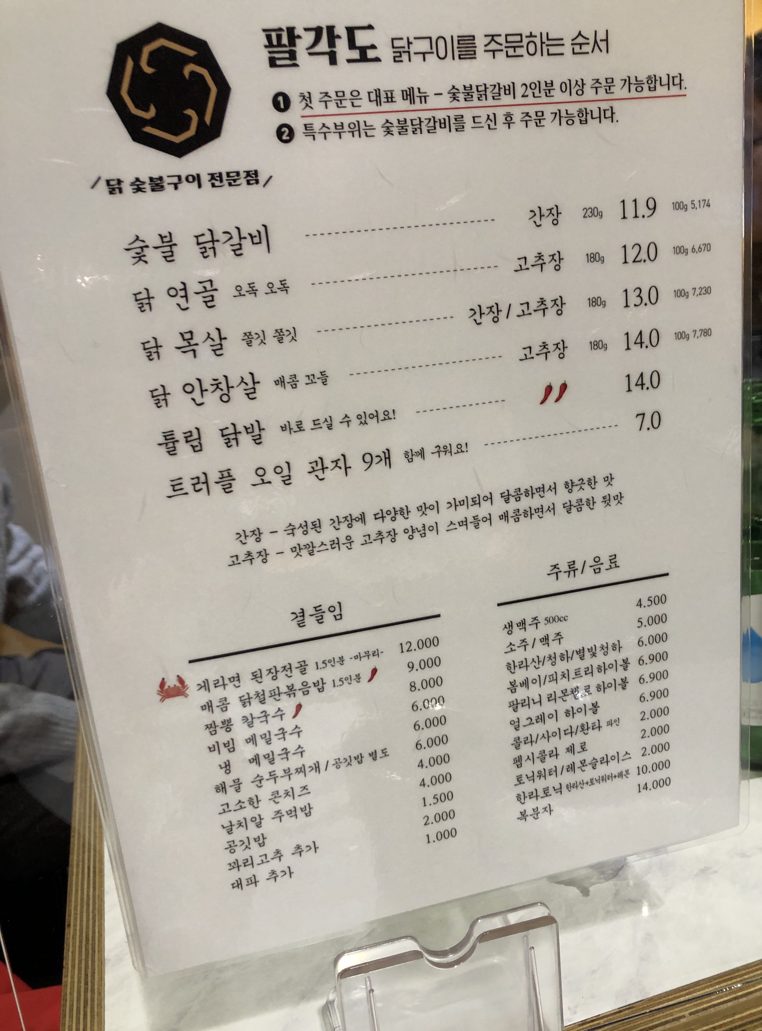 팔각도 메뉴입니다. 첫 주문은 대표 메뉴인 숯불닭갈비를 2인분 이상 주문해야지 다른 특수부위 주문이 가능하다고 해요.저희는 닭갈비 2인분을 시켰고 추가로 특수부위인 닭 목살 2인분을 시켰어요. 그리고 콘치즈와 얼그레이 하이볼과 봄베이 하이볼도 한잔씩 시켰습니다.