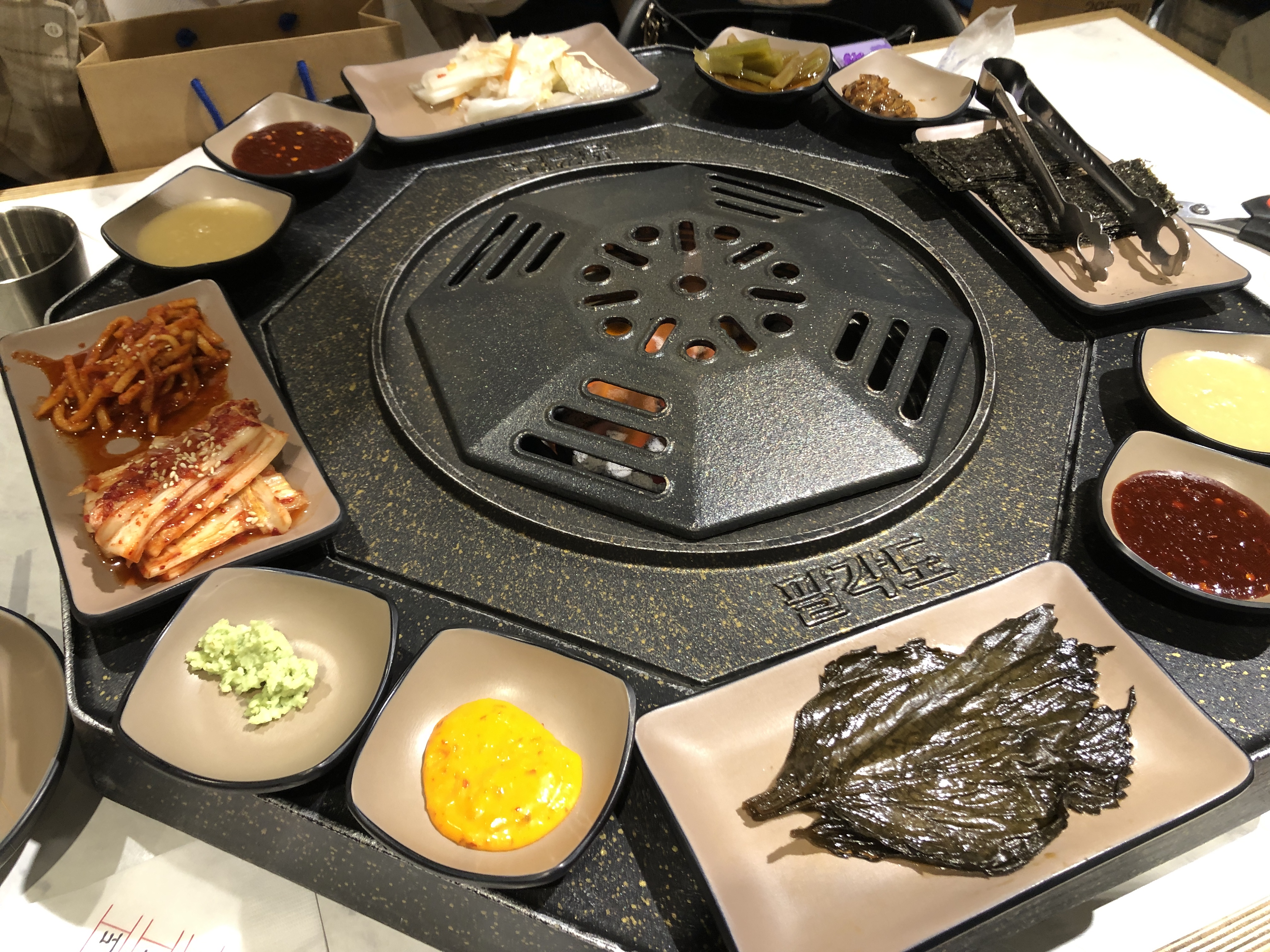 가게 이름에 충실한 불판이에요. 팔각모양의 불판에 고기를 구웠습니다. 주변에 반찬이랑 다양한 양념들도 셋팅되어 있는 게 신선했습니다.