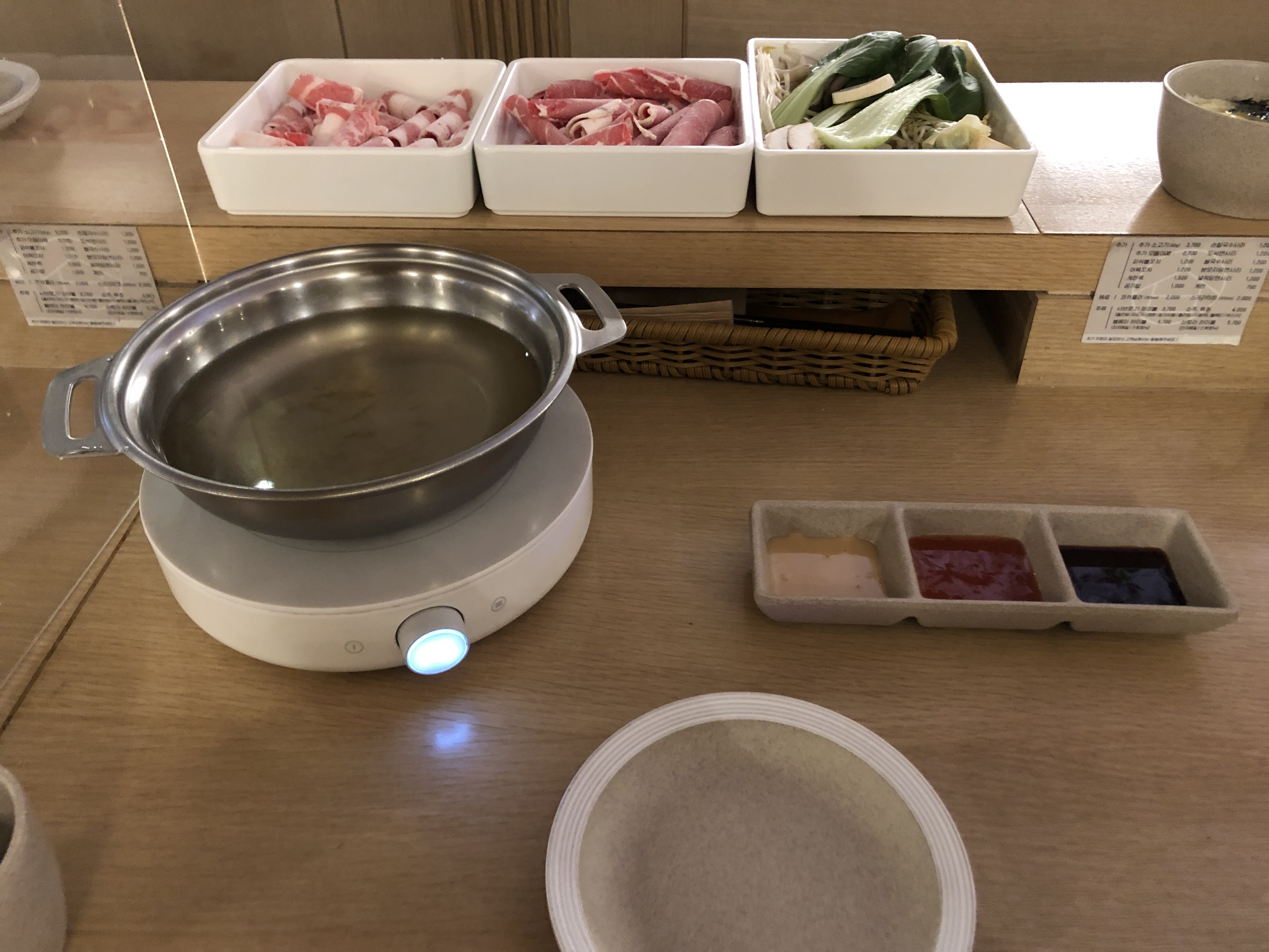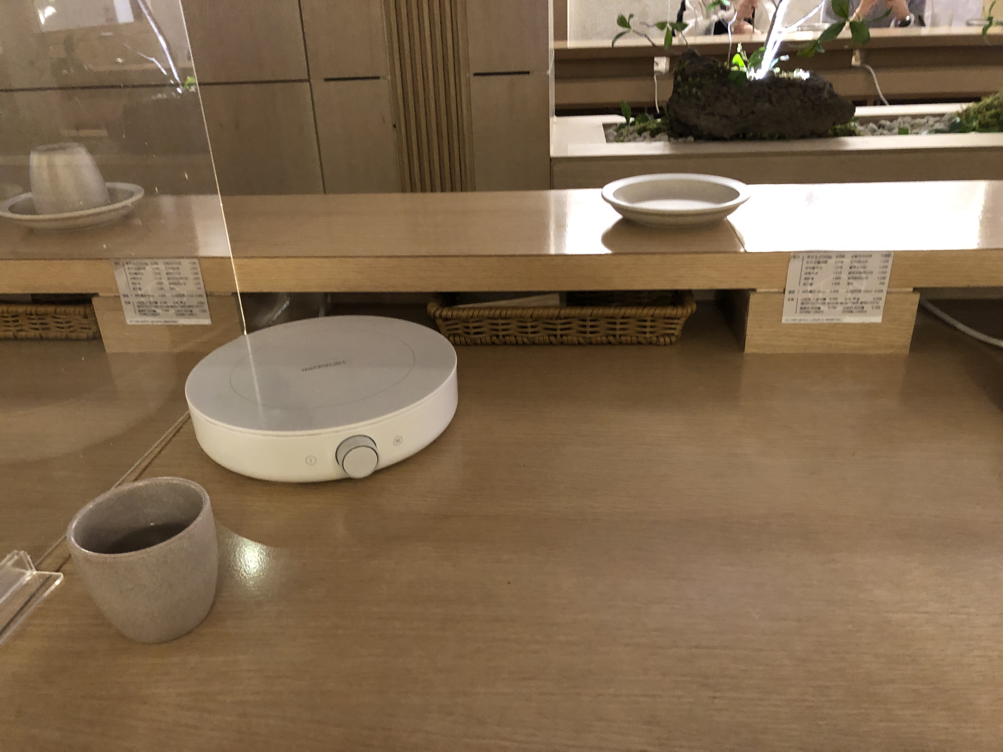 자리에는 1인용 전기레인지가 놓여있습니다. 흰색 인덕션 깔끔하고 좋은데요? 조작법을 헷갈렸던건 안 비밀입니다... 주문은 아이패드로 주문을 했었어요.