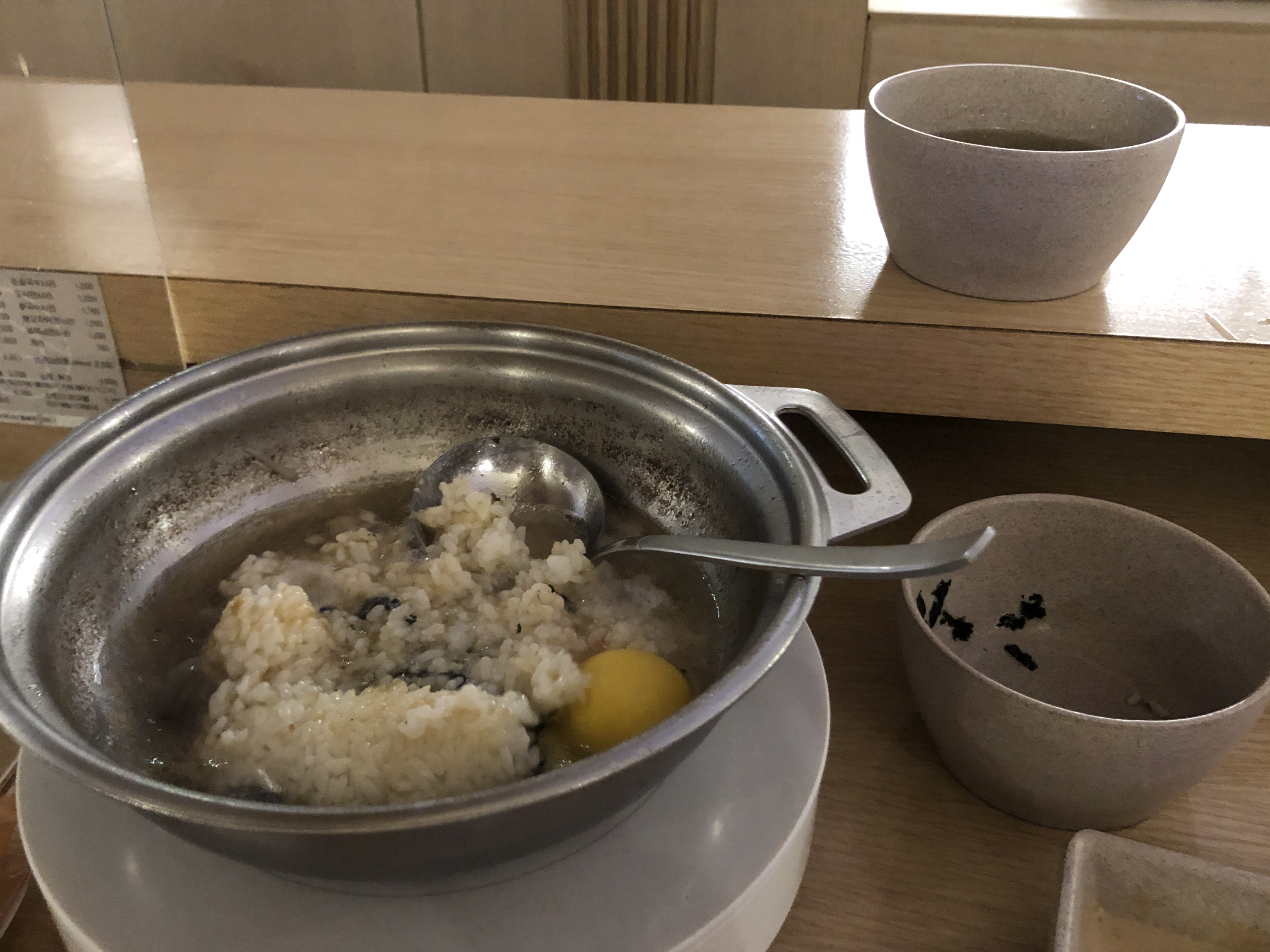 주문한 죽이 나왔는데 아쉽게도 죽은 셀프로 직접 해먹어야 했어요. 그리고 육수가 아직 많이 남아있는데 죽 만들 땐 육수를 좀 덜어내서 만들잖아요. 따로 덜어낼 그릇을 안 주셔서 요청하니 육수를 담을 수 있는 그릇을 주셨습니다. 그릇에 육수 덜어내고 죽을 만들었어요. 죽 직접 만든 거 자랑했더니 지인분이 잘 만들었다고 칭찬해 줬네요ㅋㅋㅋ 아무튼 죽까지 추가해서 딱 먹으니까 기분 좋게 배부르고 만족스러운 식사였습니다.