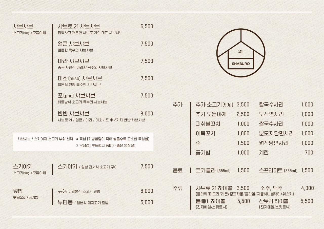 샤브로 21 메뉴입니다. 찍어온 제가 앉은 좌석에 있는 메뉴를 찍어오긴 했는데 추가 메뉴밖에 적혀있지 않아서 지도 정보에서 메뉴판을 가져왔어요. 가격이 매우 저렴해요! 저는 샤브로21 샤브샤브에 소고기를 추가했고요. 디저트(?)로 죽을 추가 했습니다. 소고기 부위는 목심과 우삼겹을 선택할 수 있는데 각각 하나씩 선택했어요. 하이볼도 팔고 있네요. 이번엔 술을 안 마셨는데 다음엔 하이볼 한잔하고 싶네요!