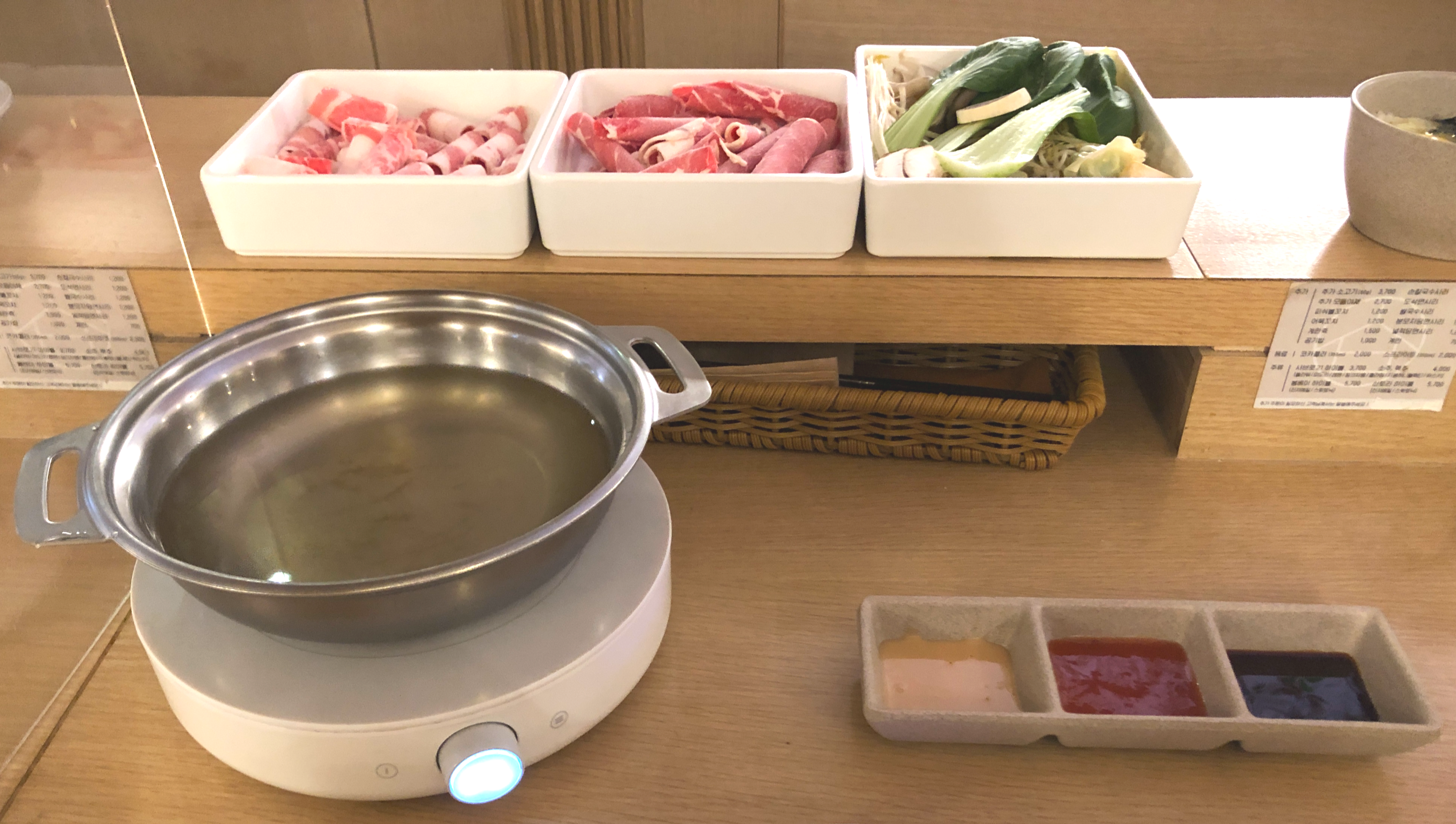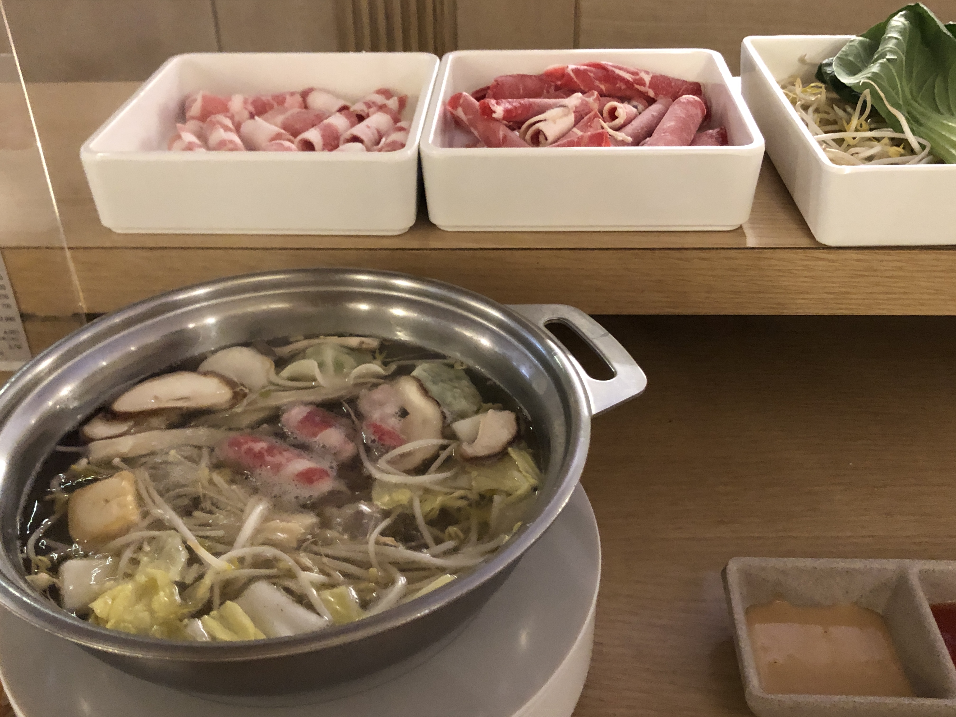 샤브로21 내부입니다. 처음에 들어갔을 때 마라향이 난다고 생각했는데 마라가 들어간 육수 메뉴도 있었어요. 여러 명이서 온 손님도 있었지만 혼자서 온 손님들도 많았고요. 아크릴 칸막이도 쳐져 있었고 딱 혼밥하기 좋은 구도였어요.