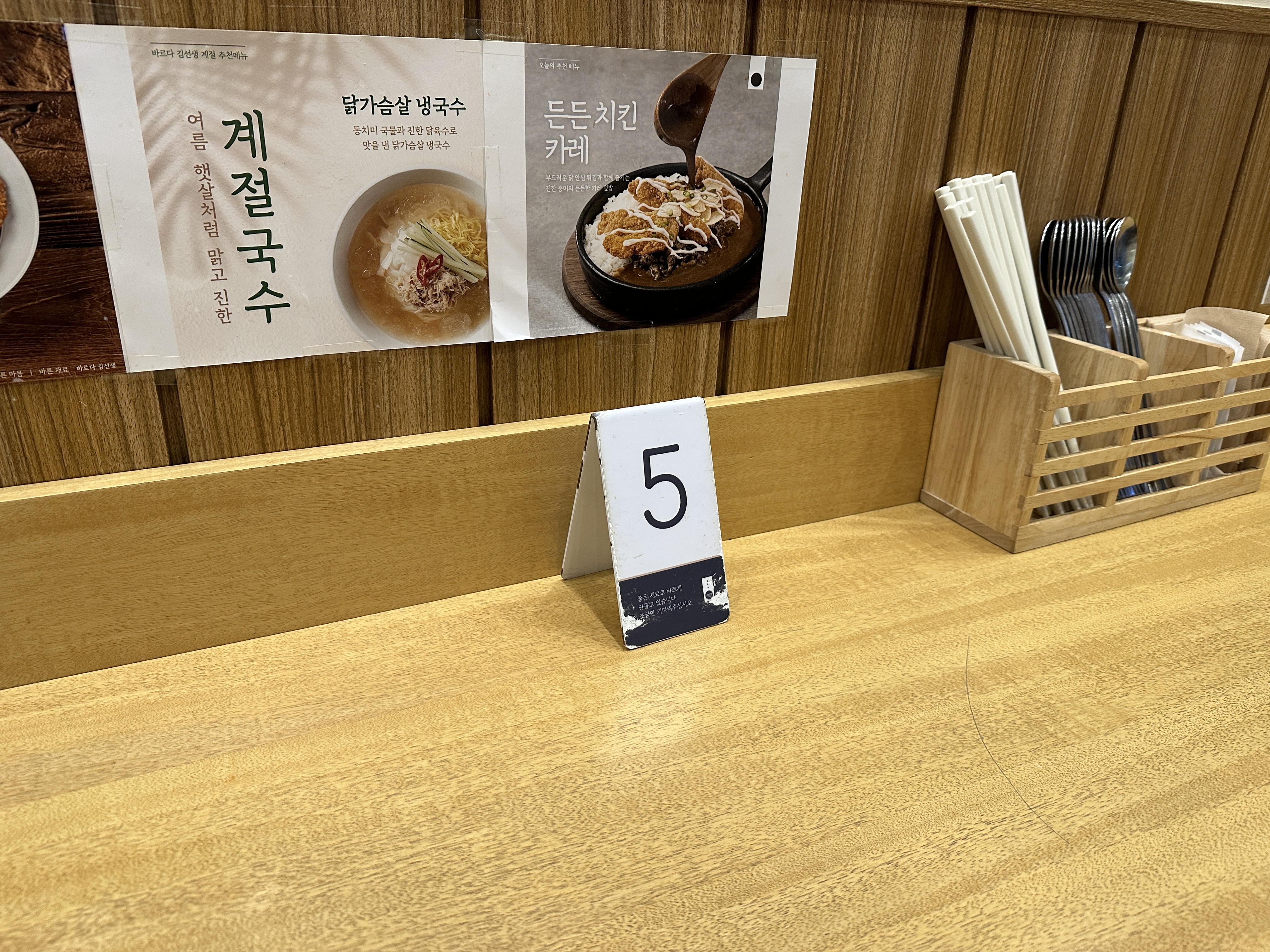 키오스크로 주문을 끝나고 번호판을 들고 책상에 두면 음식을 가져다 주신다고 합니다. 성질이 급해서 국을 직접 뜨러갔는데 셀프는 아닌거 같았어요. 물이랑 반찬을 가져다 주셨습니다 ㅎㅎ.. 바르다 김선생 물은 구수한 보리차 같은 맛이었는데 물 맛집이라고 생각했습니다. 맛있게 마셨습니다.