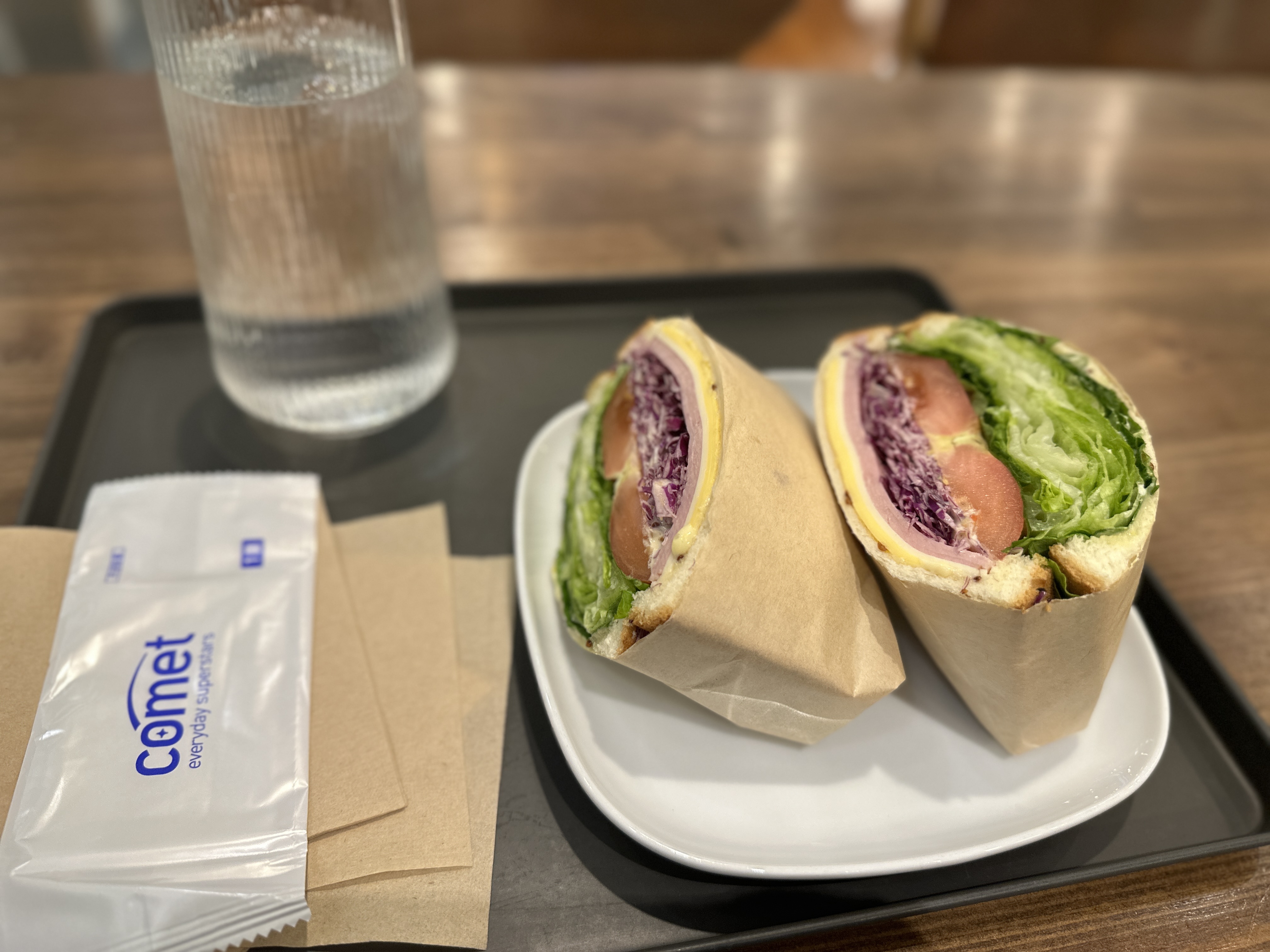 제가 주문한 햄치즈 샌드위치가 나왔습니다. 양상추 듬뿍 들어있는거 보이시나요. 도톰한 토마토랑 적 양상추도 들어있네요. 시원한 얼음물도 함께 주십니다. 햄치즈 샌드위치인 만큼 아랫부분에 햄치즈가 보여요. 색상이 다른걸로 봐서 다른 종류의 치즈인거 같습니다.