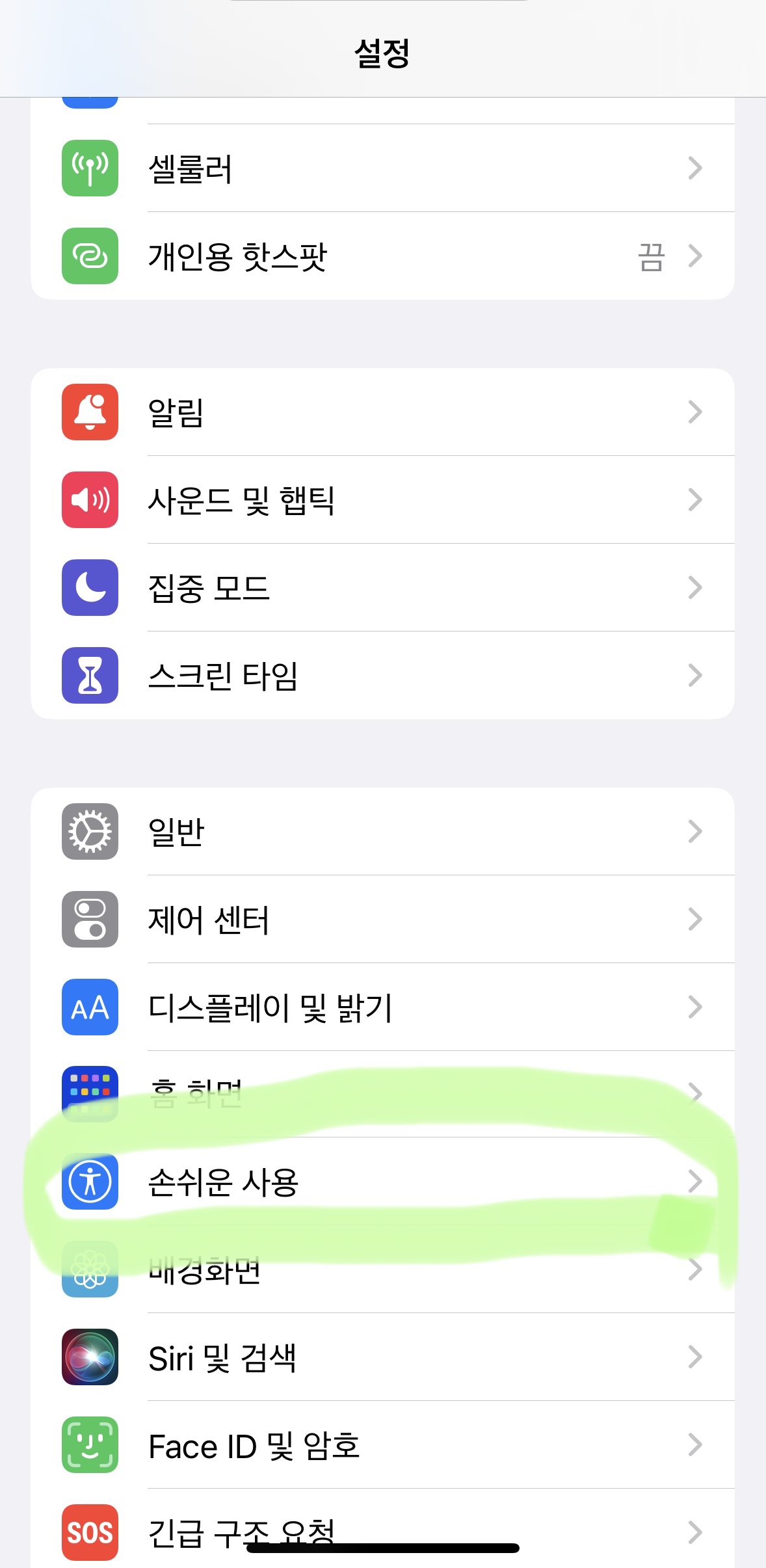 1. 우선 아이폰 설정으로 들어가서 손쉬운 사용을 클릭합니다.
