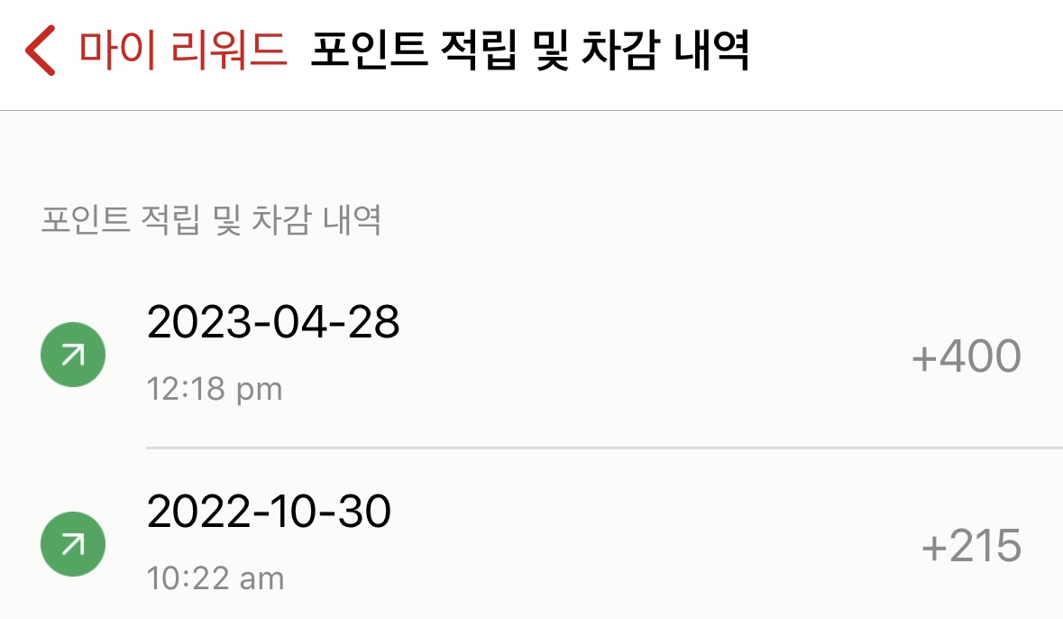 그리고 맥도날드 할인 쿠폰 적용해서 버거를 샀는데 적립도 되는지는 모르겠더라고요. 일단 적립 바코드가 나올때 바코드도 찍긴 했습니다만 적립 내역에 들어가니 적립된내역이 안보이더라고요. 그런데 몇분 있다가 다시 확인해보니 적립된걸 확인할 수 있었어요. 400원이 적립이 되었네요! 맥도날드 쿠폰을 사용해도 적립까지 되는걸 확인할 수 있었습니다.