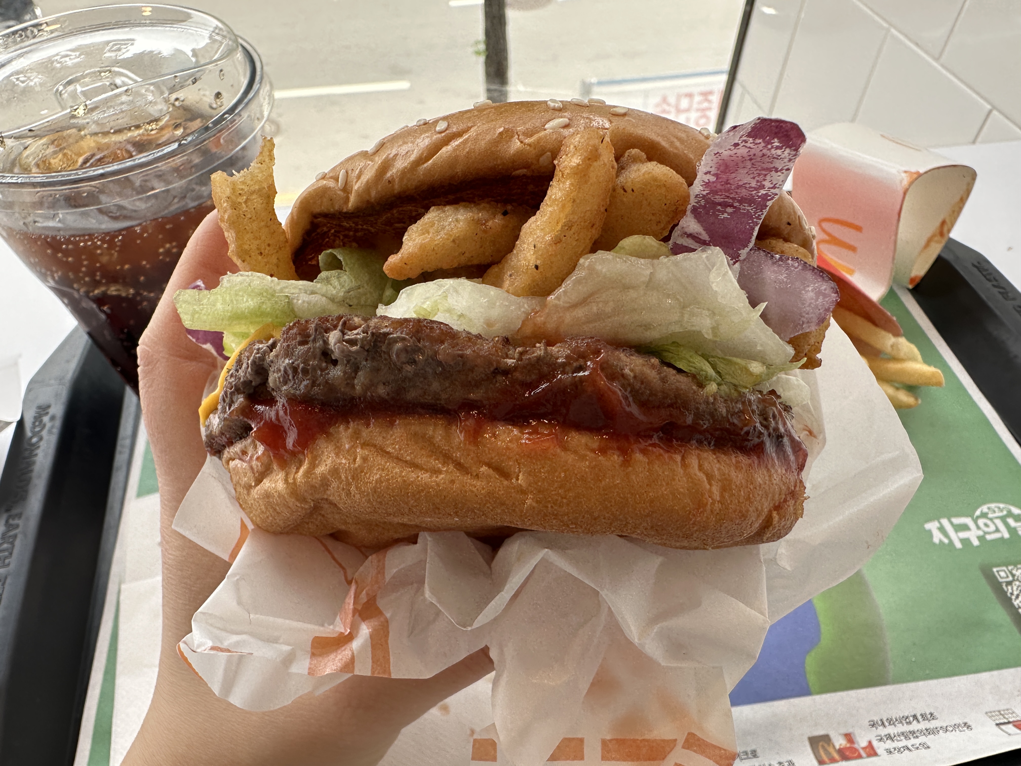 튀긴 감자와 적색양파가 보이네요. 구운양파, 적양파,튀긴 양파까지 3종류의 양파가 들어가서 트리플 어니언버거라고 합니다. 음~ 개인적으론 양파튀김이 들어간게 극적으로 맛있다는 느낌은 받지 못했어요. 개인적으론 기존 1955버거가 깔끔하고 더 입에 맞았어요. 그나저나 이때 먹은 매장의 감자튀김이 너무 바삭하고 맛있어서 만족스러웠어요!! 버거도 배달보단 매장에서 먹는게 더 맛있는거 같아요.