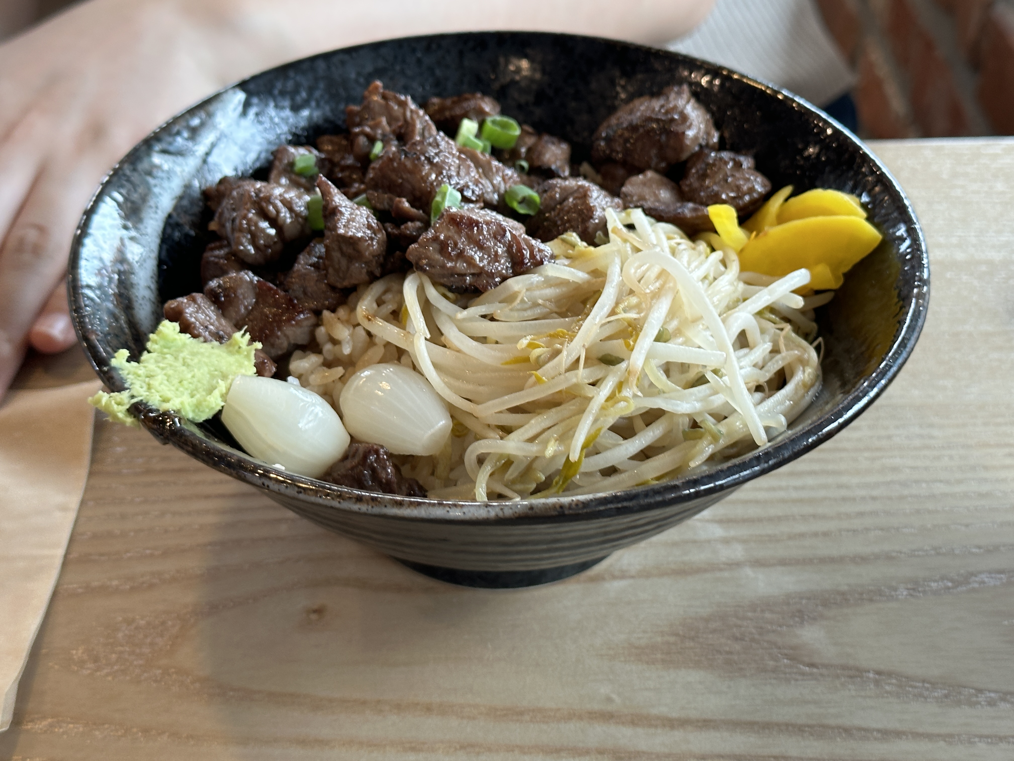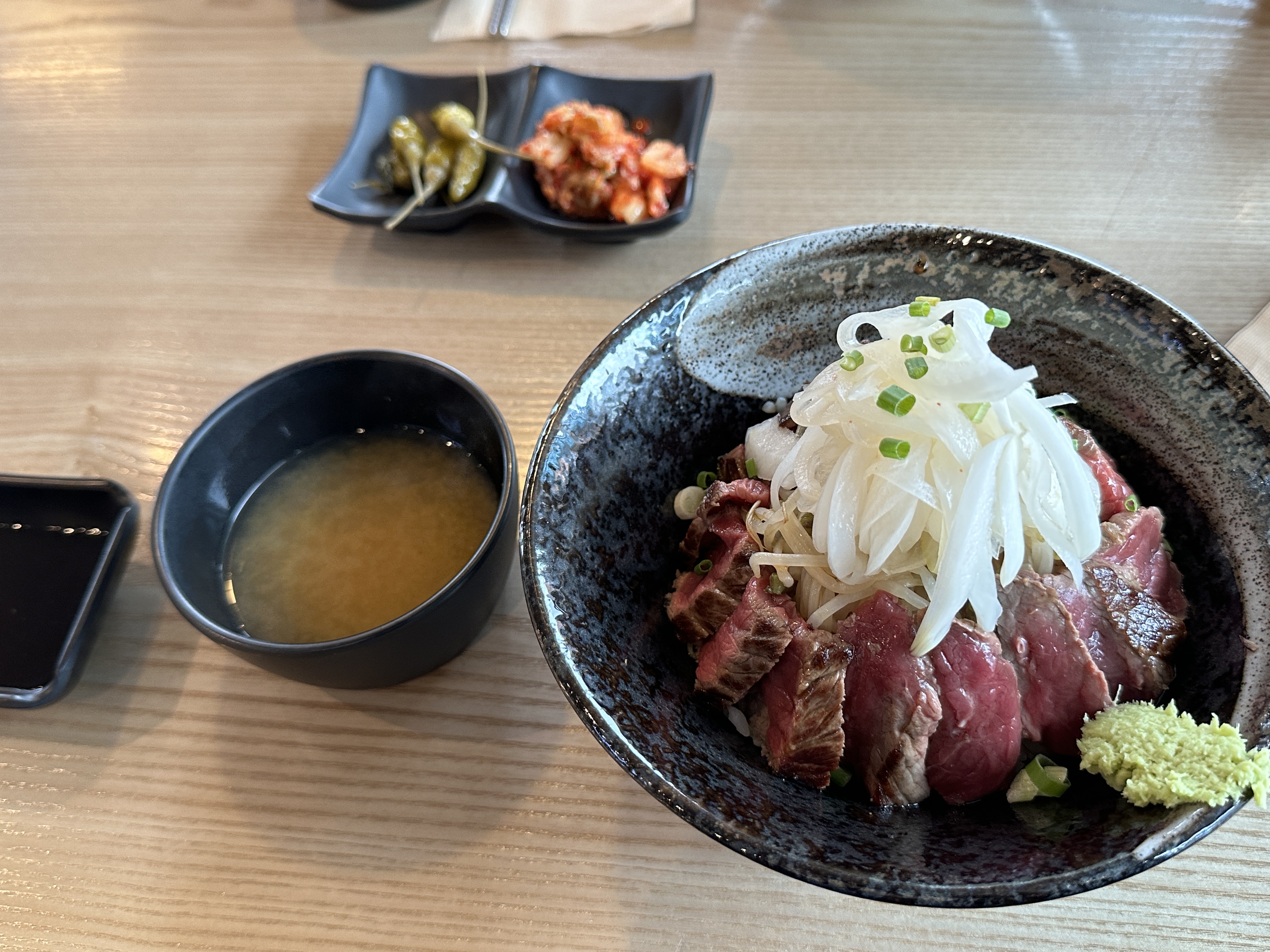 밑반찬으로 김치와 고추초절임이 나왔습니다. 제가 시킨 스테이크 덮밥이에요. 저는 미디엄 레어를 좋아해서 괜찮았는데 빠짝 익히지 않은 고기가 싫으시면 호불호가 갈릴 거 같아요. 숙주와 양파, 와사비랑 함께 곁들여 먹었습니다. 뭔가 홍대에서 먹은거 보다 더 깔끔한 느낌이고 맛있게 먹었네요. 체인점 짱…