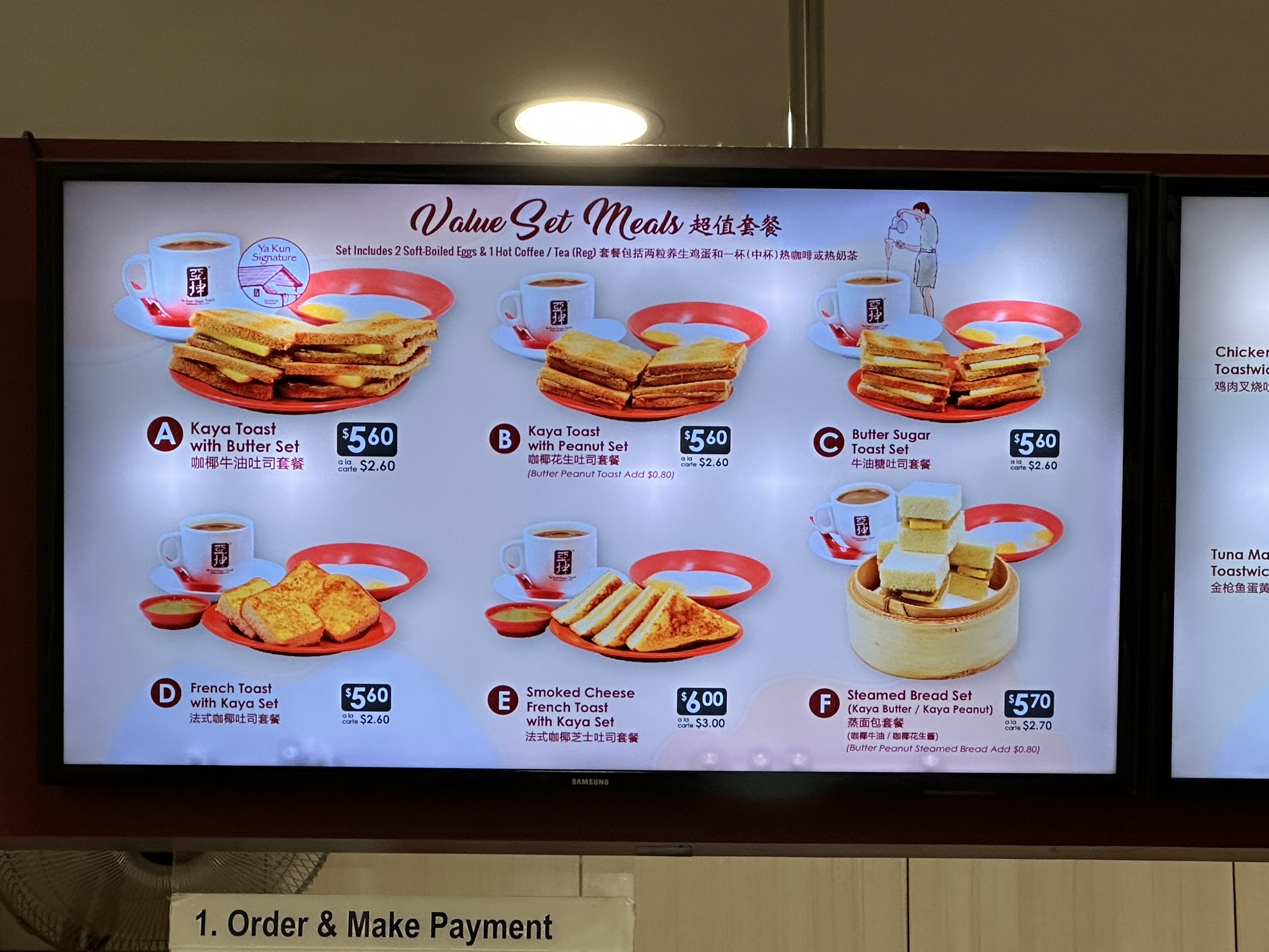 나는 야쿤카야 토스트 초심자니까 무난해 보이고 많이들 추천하는 A세트를 시켰다. 카야토스트와 버터가 들어가 있고 계란과 커피가 나오는 조합이다.