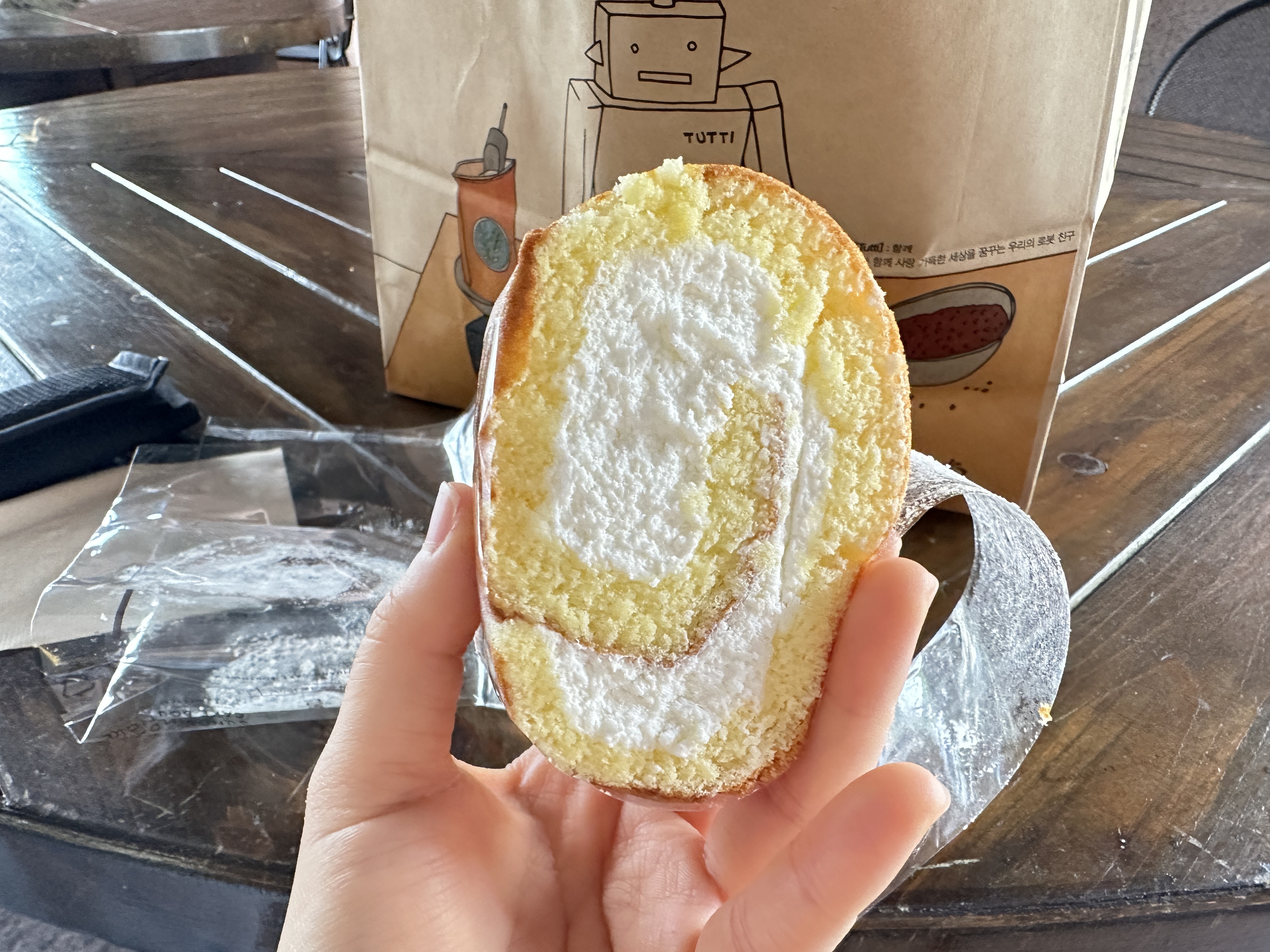 이때 슬슬 배고프기도 했고 구매한 빵 몇 개는 바로 먹으려고 백화점 야외의 테라스에서 바로 길빵(길거리에서 빵 먹기)을 했습니다. 먼저 너무너무 궁금했던 순수롤부터 먹었어요. 순크림빵도 맛있단 얘기를 들어서 궁금했으나 이것도 크림류라 오래 가지고 다니기 힘들 거 같아서 순수롤 낱개만 구매했어요.