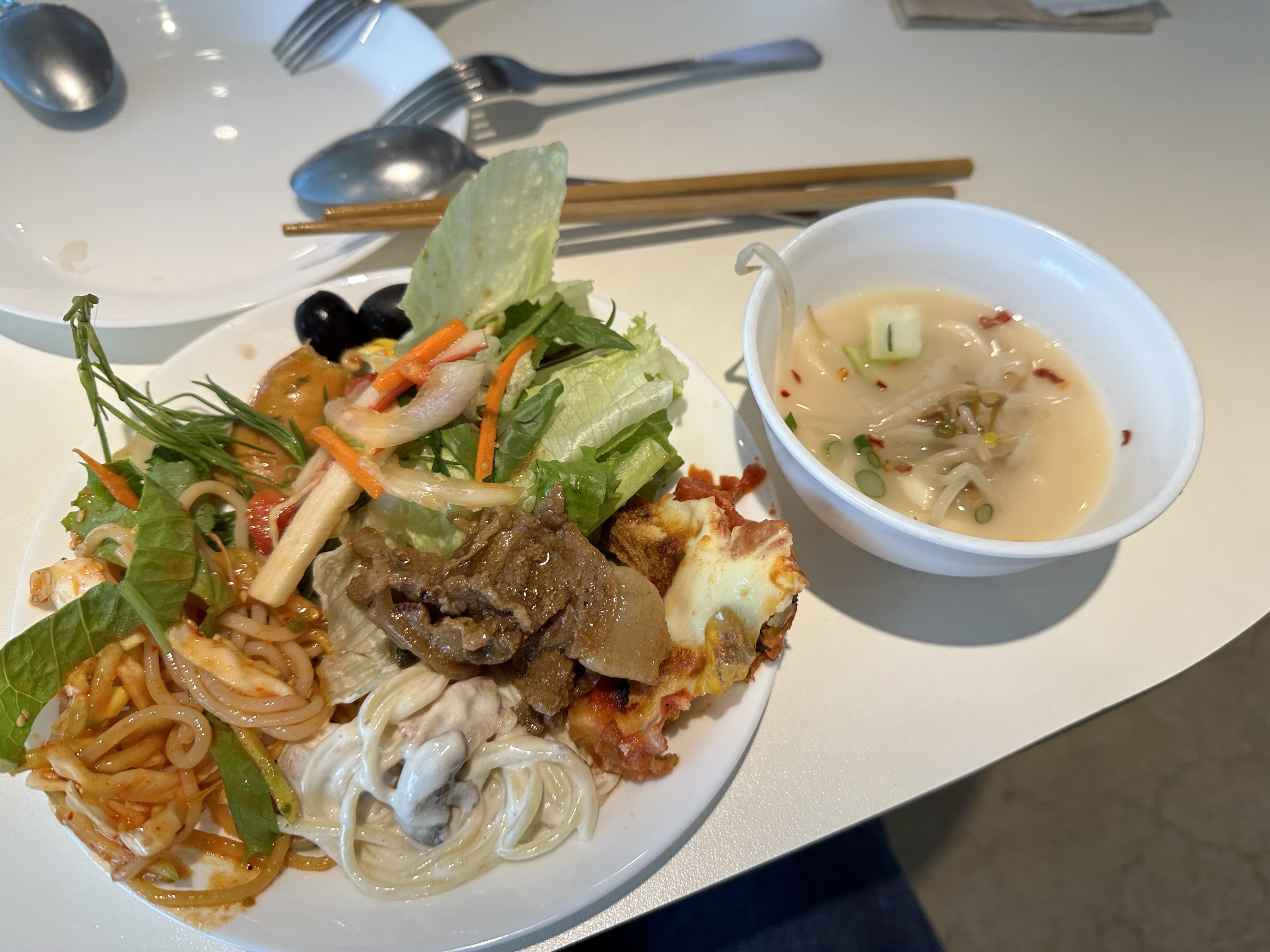 처음엔 국룰인 수프를 먹어주고 다양한 음식을 담아와서 먹었습니다. 파스타가 정말 맛있어서 또 먹고 싶네요. 샐러드도 채소 상태가 좋아서 열심히 퍼먹었어요. 나가사키 짬뽕은 기대했는데 맛은 그저 그랬어요. 그리고 고기 종류가 제가 갔던 날에는 한 종류만 있었고 대부분 탄수화물 위주여서 그 점이 아쉬웠습니다. 그리고 탄산음료도 없었던 걸로 기억해요. 이런 뷔페 가서 탄산음료 무제한으로 먹는 것도 좋은데 말이죠. 탄산 대신 차 종류가 있었습니다. 몇 가지는 아쉬웠지만 음식 퀄리티가 대부분 평균 이상이어서 정말 만족스러웠어요. 친구 얘기 처럼 애슐리보다 나은 퀄리티였습니다.