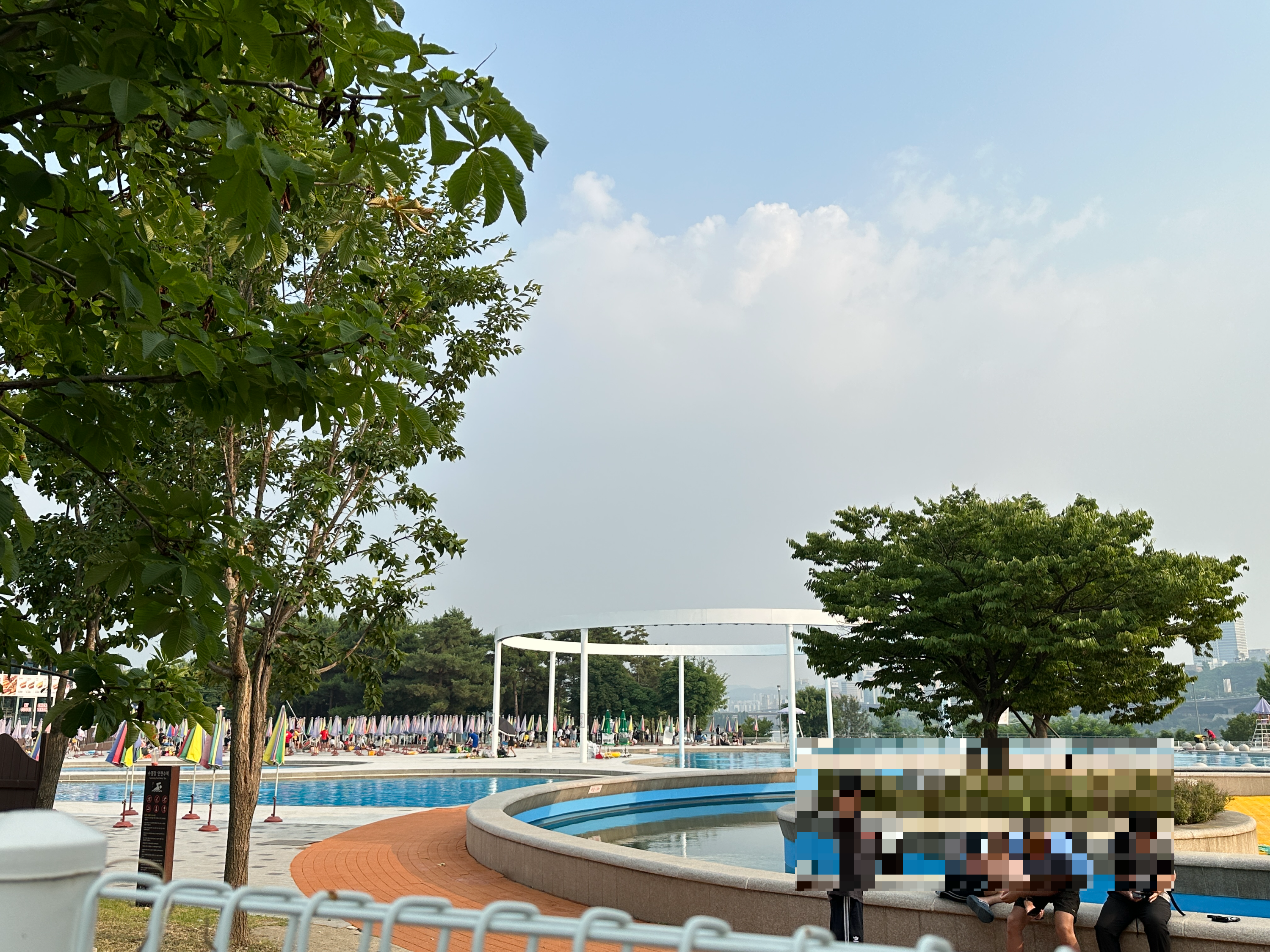 뚝섬 한강수영장 생긴 게 궁금해서 한강공원 홈페이지에서 사진을 확인했는데요. 성인풀, 유수풀, 어린이풀, 유아풀등 4개의 풀장이 있어요. 성인풀은 수심이 1m라고 되어 있었는데 레일을 넘어가면 좀 더 깊어져서 1.2-1.3m 정도 되는 거 같았습니다. 제일 큰 수영장의 끝부분이 수심이 제일 깊어서 그 곳에서 놀았어요. 저 동그란 구조물은 예전부터 뭘까 궁금했는데 물이 나오는 아쿠아링이라고 합니다. 그런데 저희가 갔을 때는 물이 나오진 않았어요. 작동 하긴 하는 거겠죠?