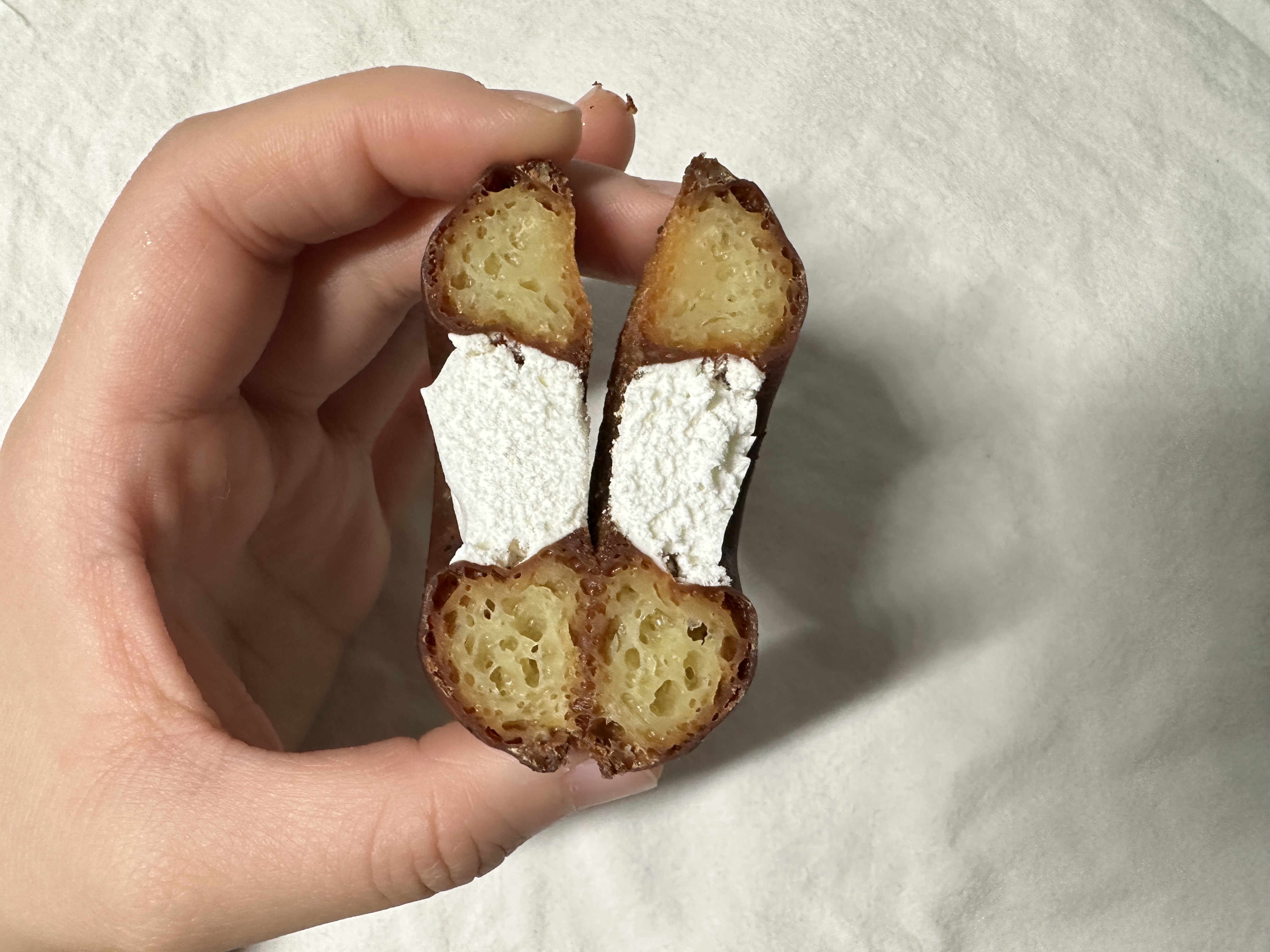 일반적인 까눌레랑 생긴 게 달라요. 튜브모양으로 생겨서 그 안에 크림이 들어있어요.