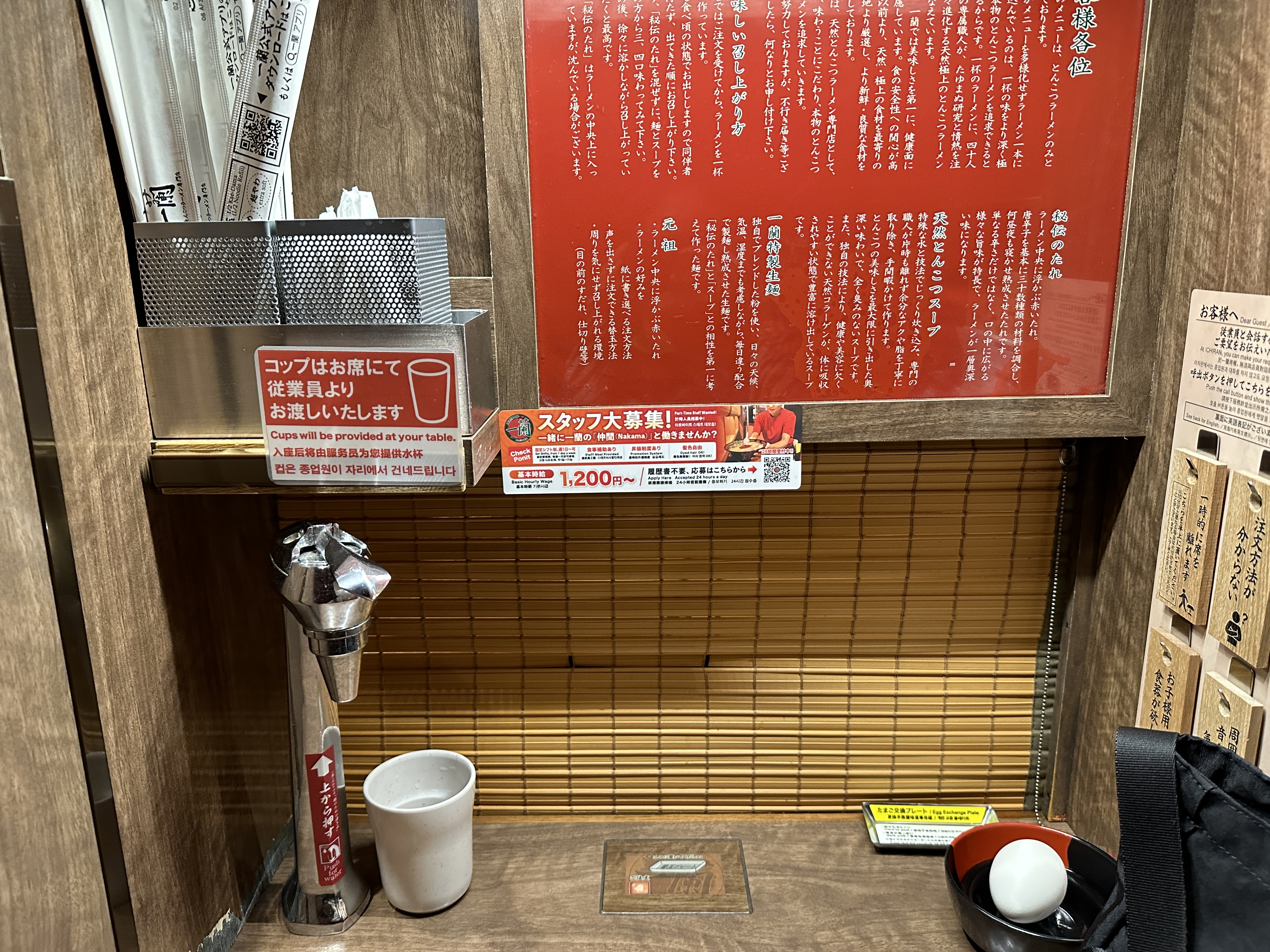 그럼 버스 티켓 같은 주문표가 나와요. 라멘이랑 계란 추가를 했으니 두장이 나옵니다. 맵기나 토핑은 다 추가하고 기본으로 했어요. 안내받은 자리에 앉아 있으면 얼굴이 발에 가려진 직원분께서 친절히 주문받아 주시고 컵도 주십니다.
