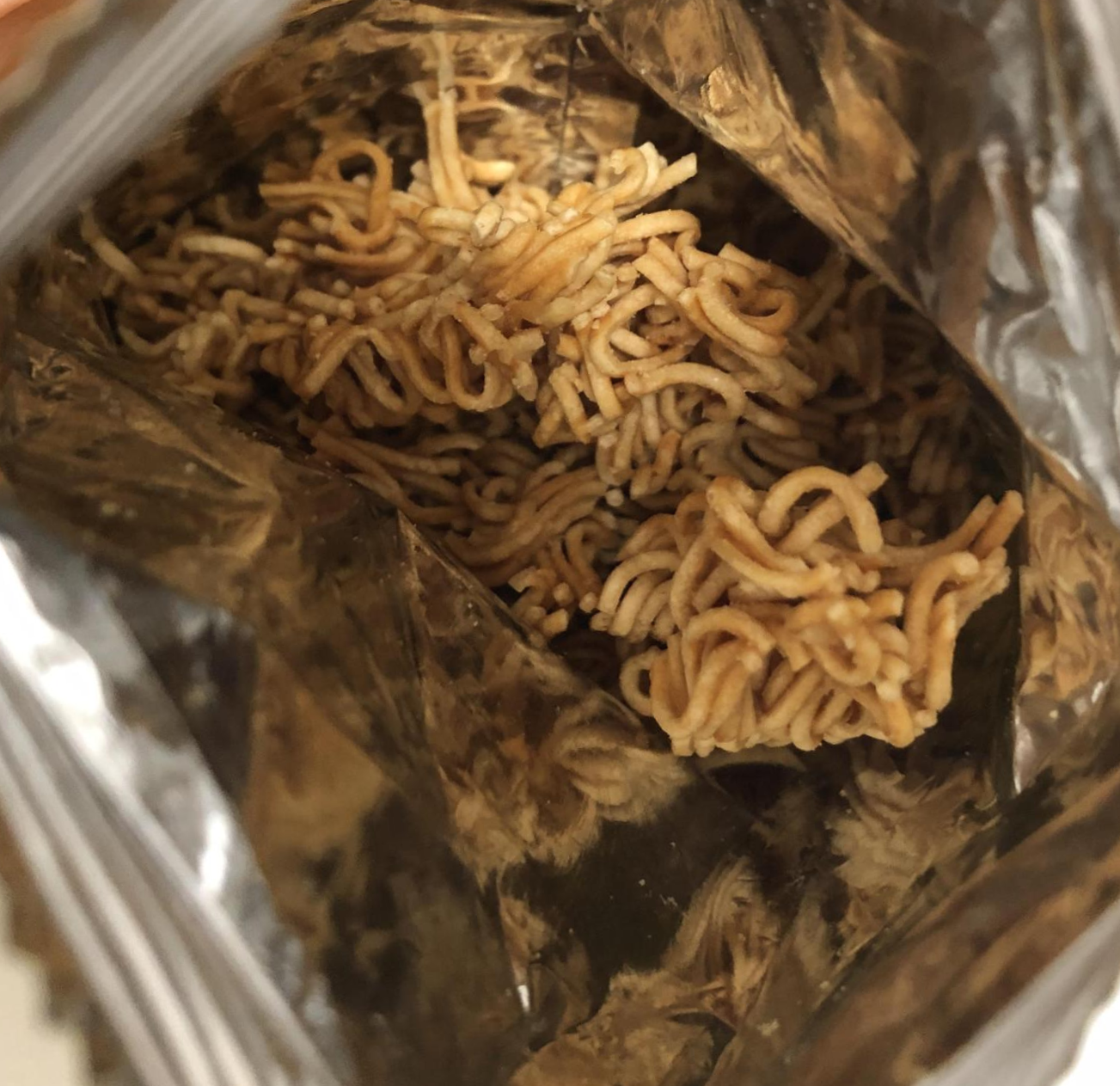 신나게 박살 낸 에낙 라면 과자 내부 모습^^ 뭔가 뿌셔뿌셔보단 얇은 뽀빠이 느낌 같기도 하다.