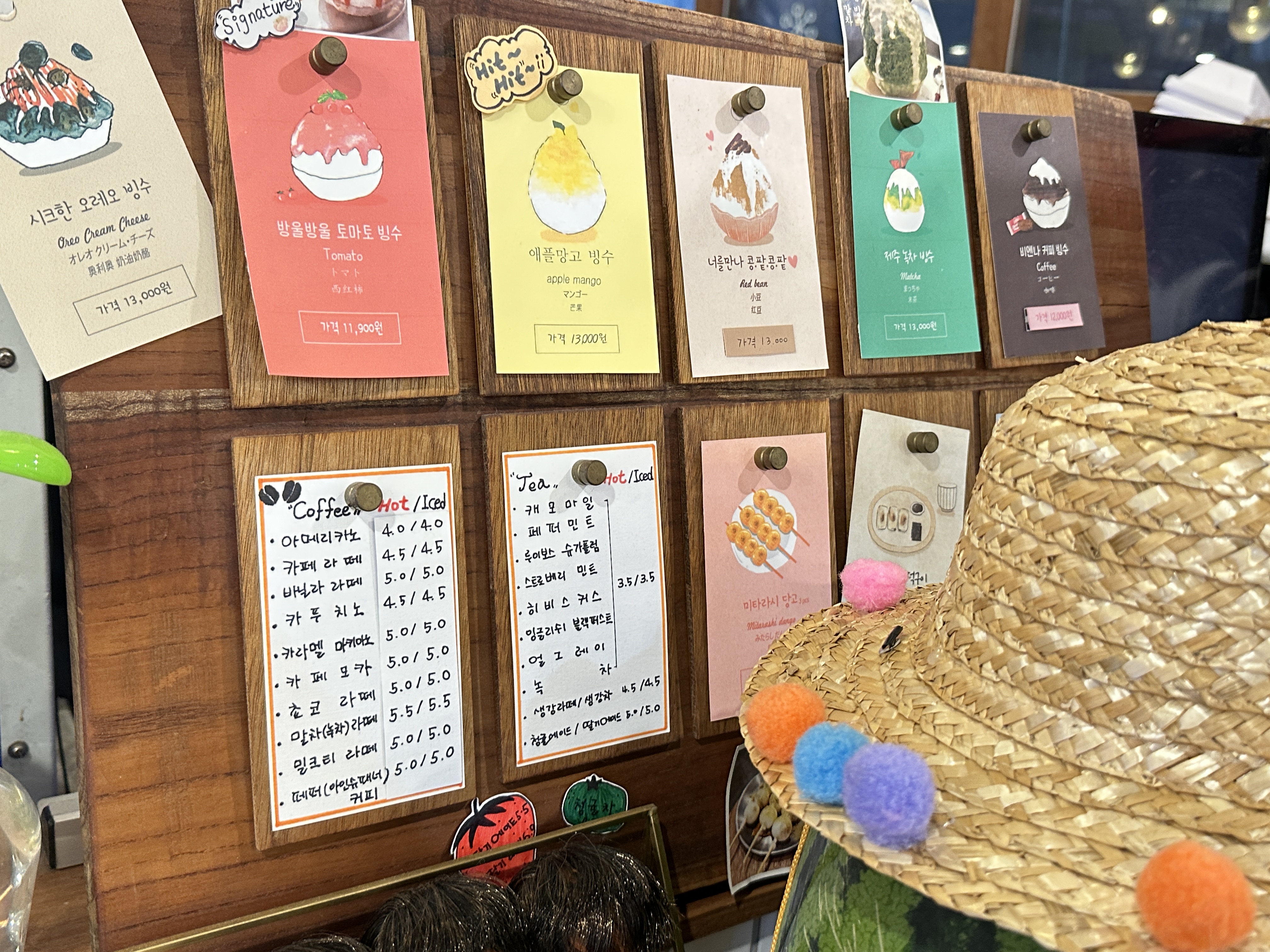 도쿄빙수 메뉴입니다. 빙수 외에 커피와 티 종류도 함께 판매하고 있어요. 일본식 카페답게 당고도 판매하고 있네요. 저희는 토마토 빙수랑 고민하다가 복숭아 빙수를 주문했어요.