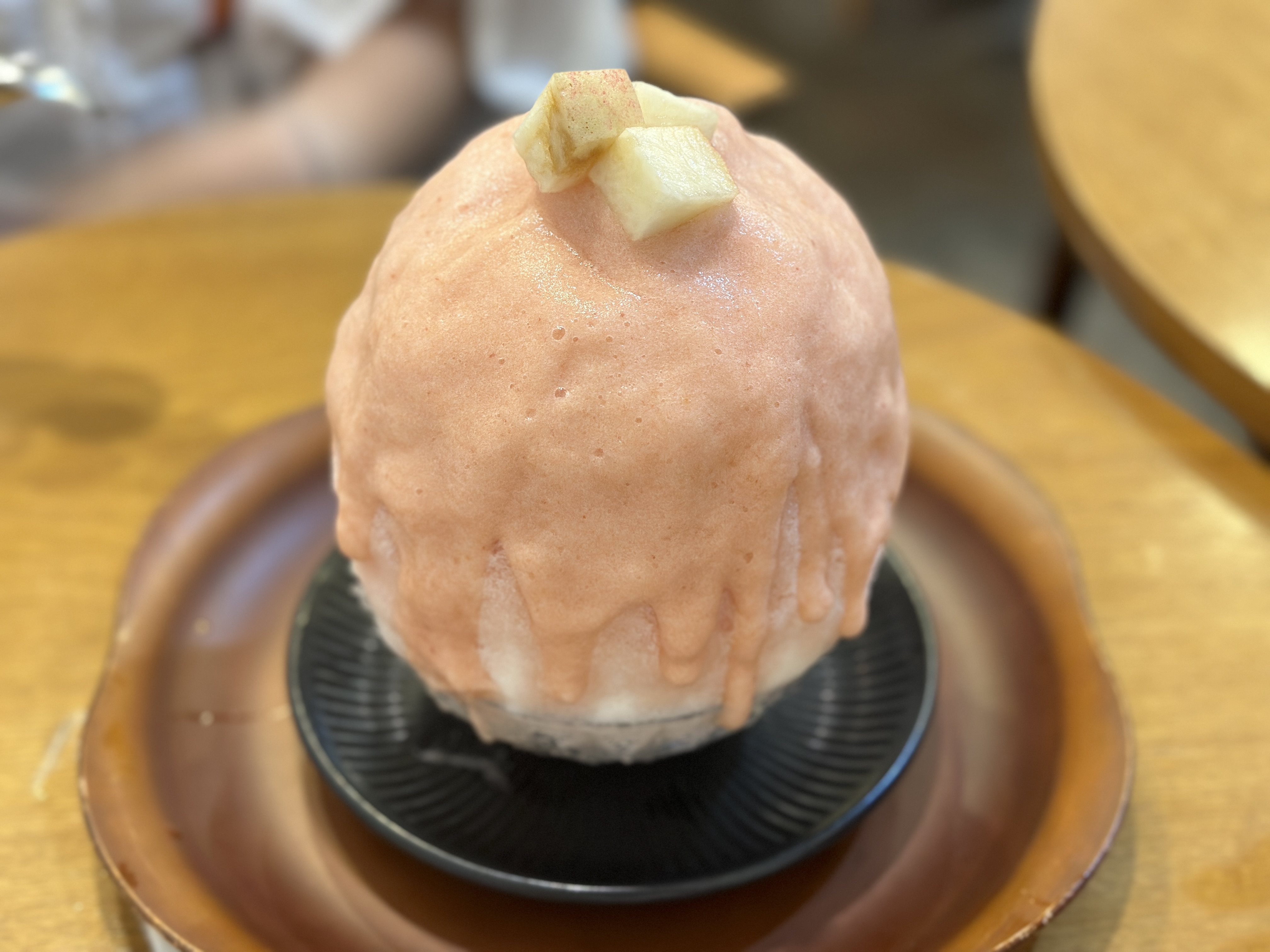 오.. 확실히 일본식 빙수는 한국빙수처럼 토핑이 많지는 않아요. 얼음 위에 시럽 한번 뿌린 느낌? 위에 올라간 복숭아 조각이 복숭아 빙수임을 알려주네요. 솔직히 비주얼이 화려하지 않아서 크게 기대는 안했는데요. 위에 뿌려진 복숭아 시럽이 직접 복숭아를 갈아서 만든건지 정말 진한 복숭아 맛이 나더라고요. 얼음도 부드럽게 갈려서 꽤 맛있게 먹었습니다. 복숭아 빙수 맛이 괜찮았어요. 추천드립니다.