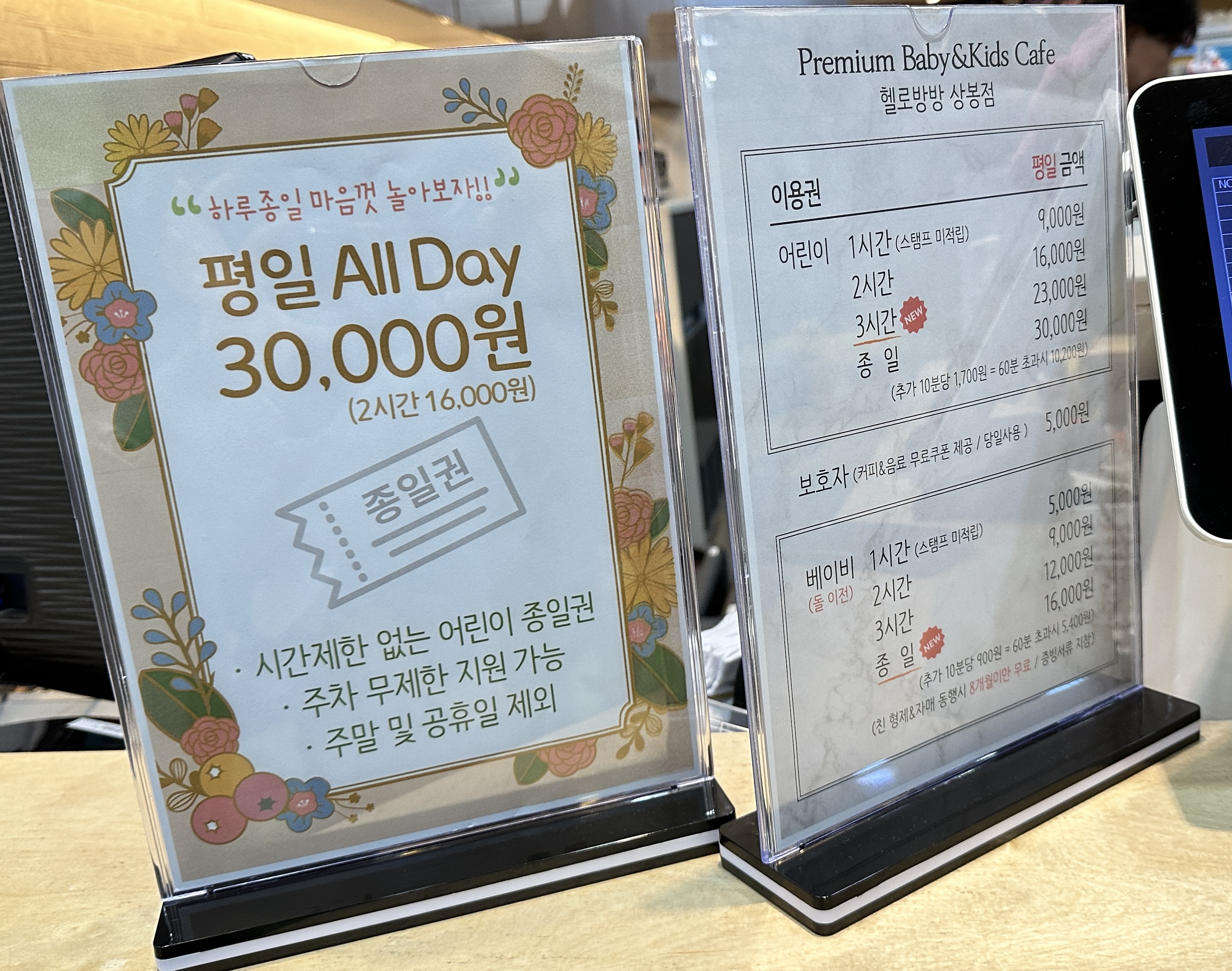 헬로방방 상봉점 가격은 보호자는 커피&음료 무료쿠폰 제공에 5,000원이고요. 어린이는 1시간에 9,000원 2시간 16,000원 종일권은 30,000원이에요. 돌 이전 아기는 더 저렴하네요. 참고하세요!