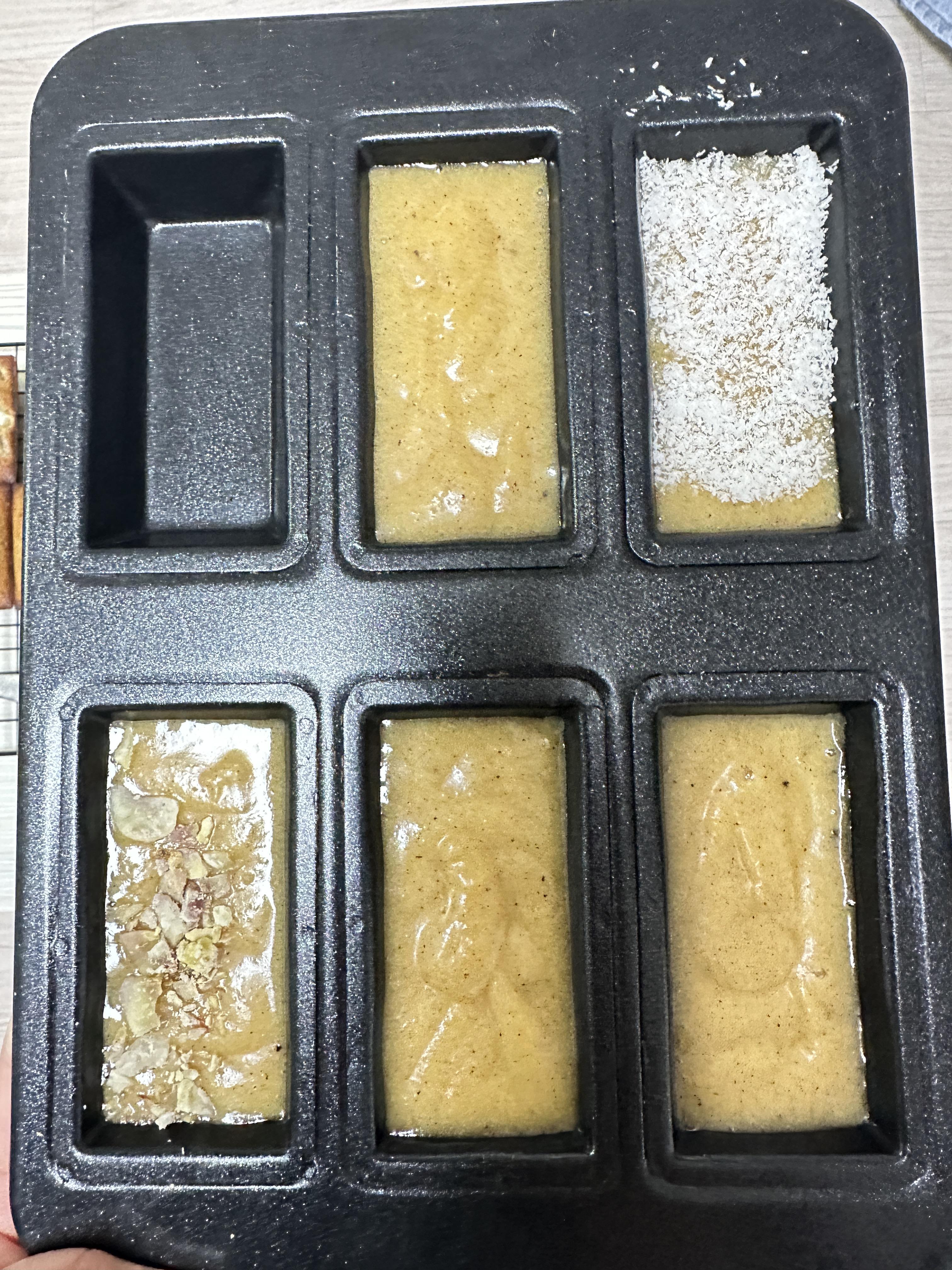 마지막 네번째 판도 밤과 코코넛 가루를 뿌려 마무리해줬습니다. 이런 방법으로 초간단 5가지 맛 휘낭시에를 만들어 봤는데요.